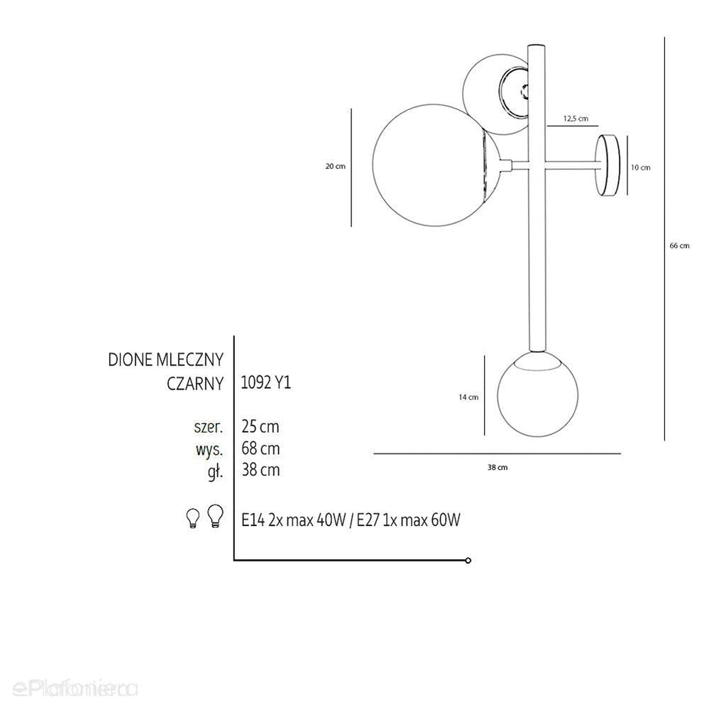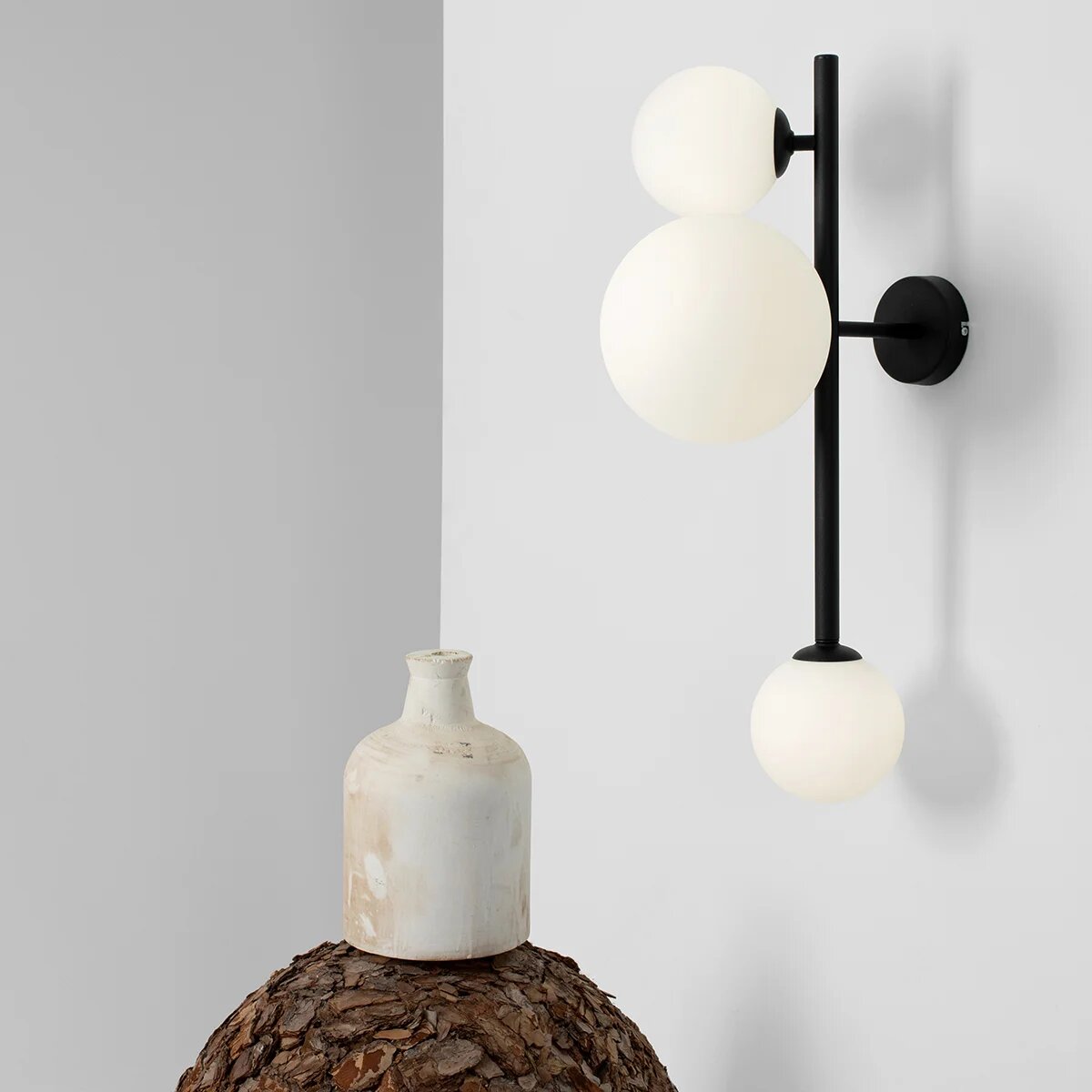 Nowoczesna lampa ścienna, mleczne satynowe klosze – kule umocowane do czarnej konstrukcji.