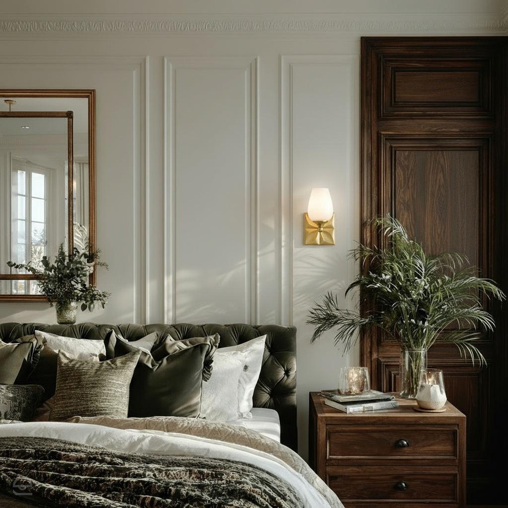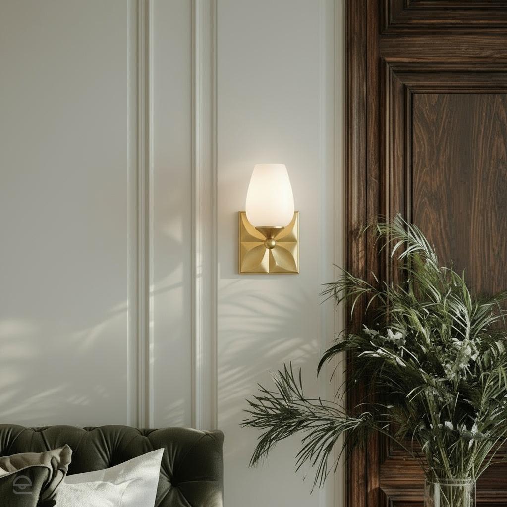 Kinkiet z kolekcji Epsilon wyróżnia się miękką, organiczną linią i subtelnym charakterem. Delikatny klosz w kształcie tulipana wykonany został z białego szkła opalowego, które rozprasza światło w przyjemny, nastrojowy sposób. Dekoracyjna rozeta na ściennej płytce oraz eleganckie wykończenie w kolorze postarzanego mosiądzu podkreślają kobiecy i ponadczasowy styl tej oprawy.