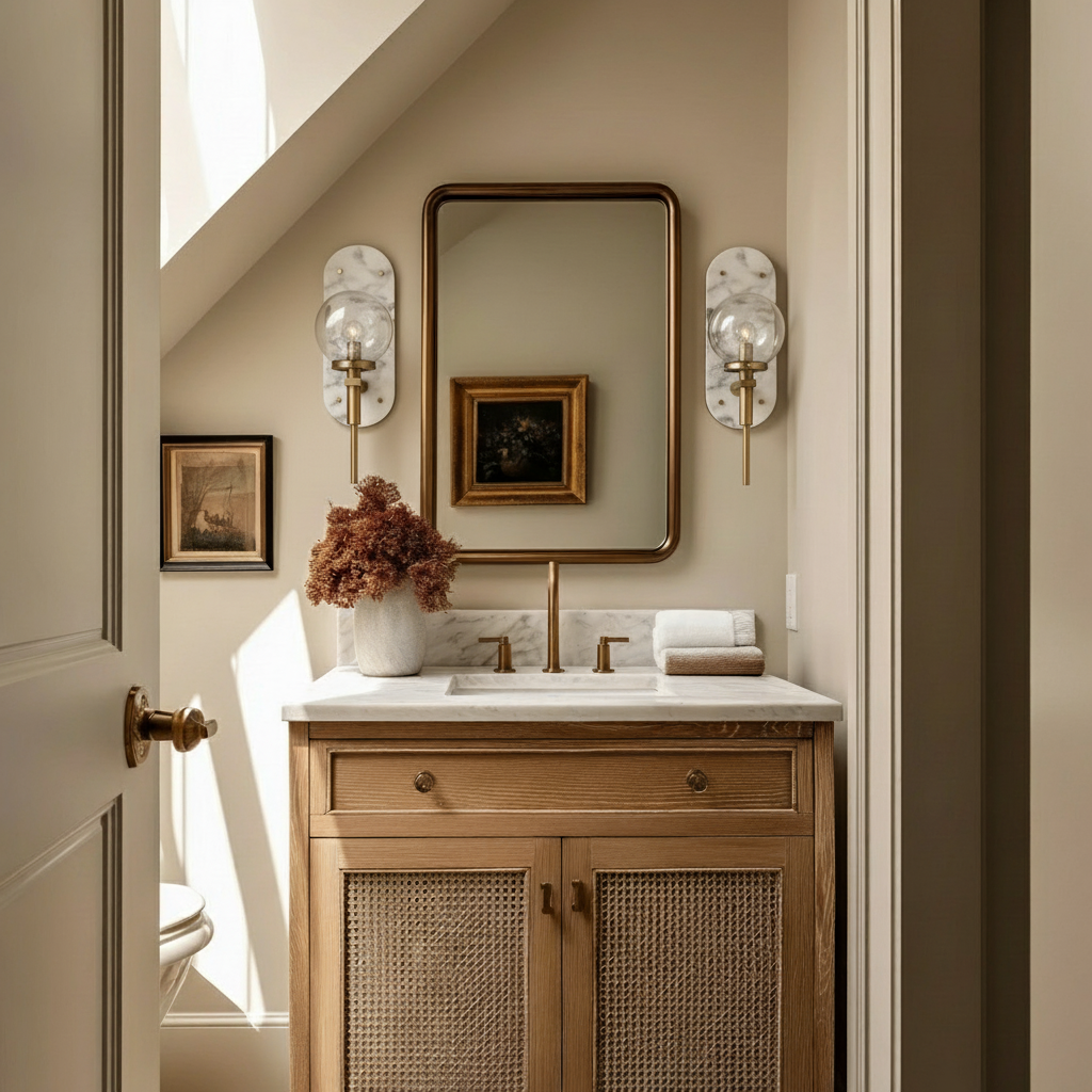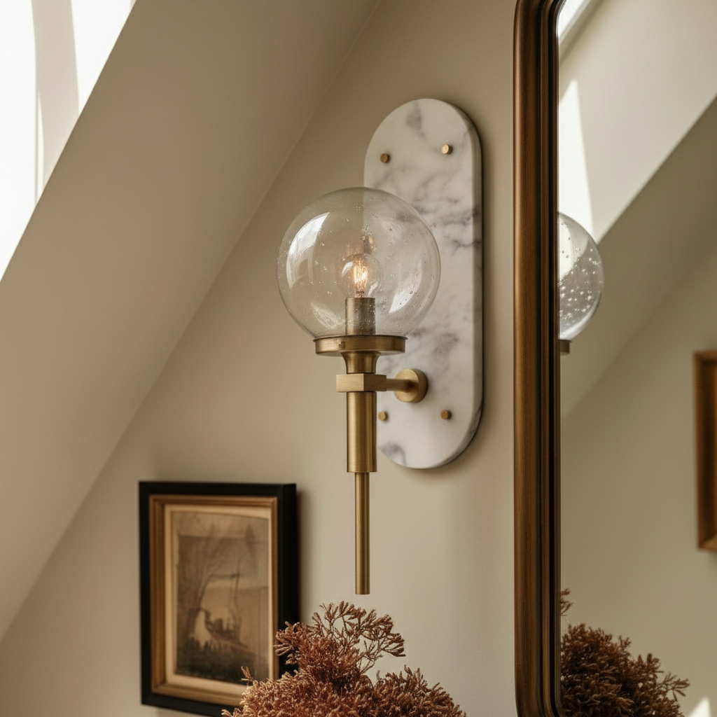 Kinkiet Gilda mosiądz ze szklanym kloszem do łazienki z imitacją alabastru