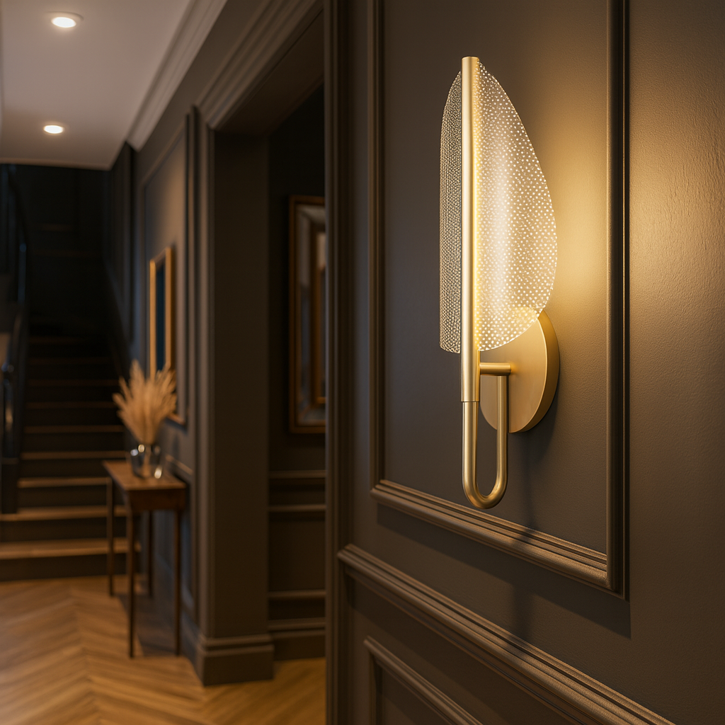 Kinkiet LED Floriana w wykończeniu naturalny mosiądz zachwyca subtelną formą inspirowaną liściem. Półprzezroczysty klosz z frezowanego akrylu osadzony jest na smukłej, pionowej konstrukcji, tworząc elegancką kompozycję z nutą art déco. Ten dekoracyjny element oświetlenia świetnie sprawdzi się zarówno w aranżacjach nowoczesnych, jak i klasycznych.
