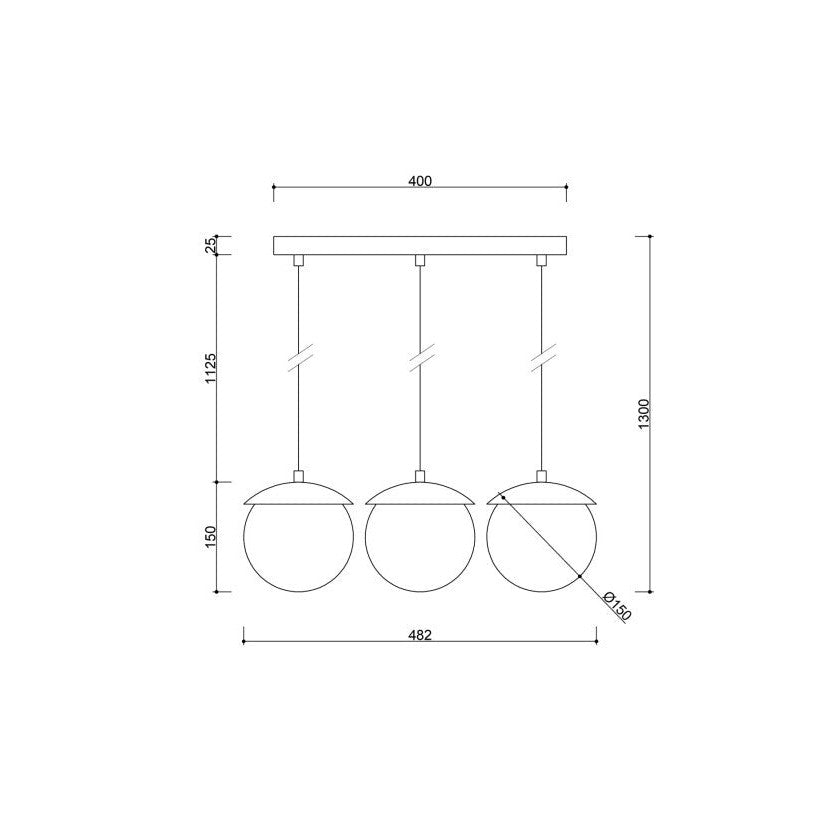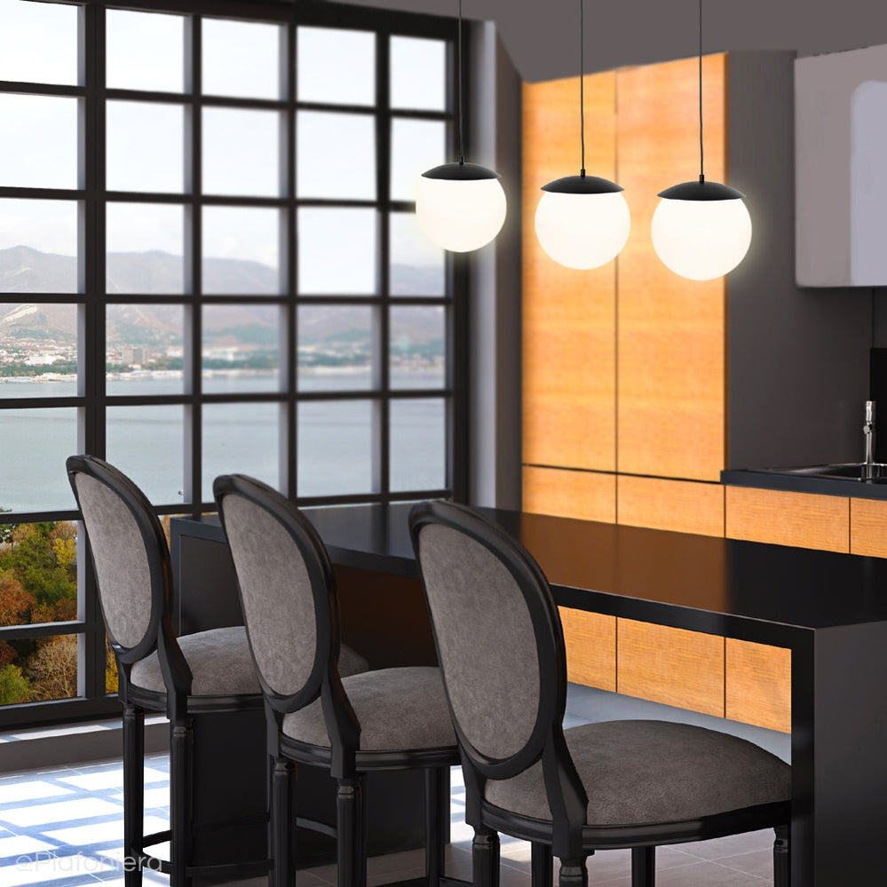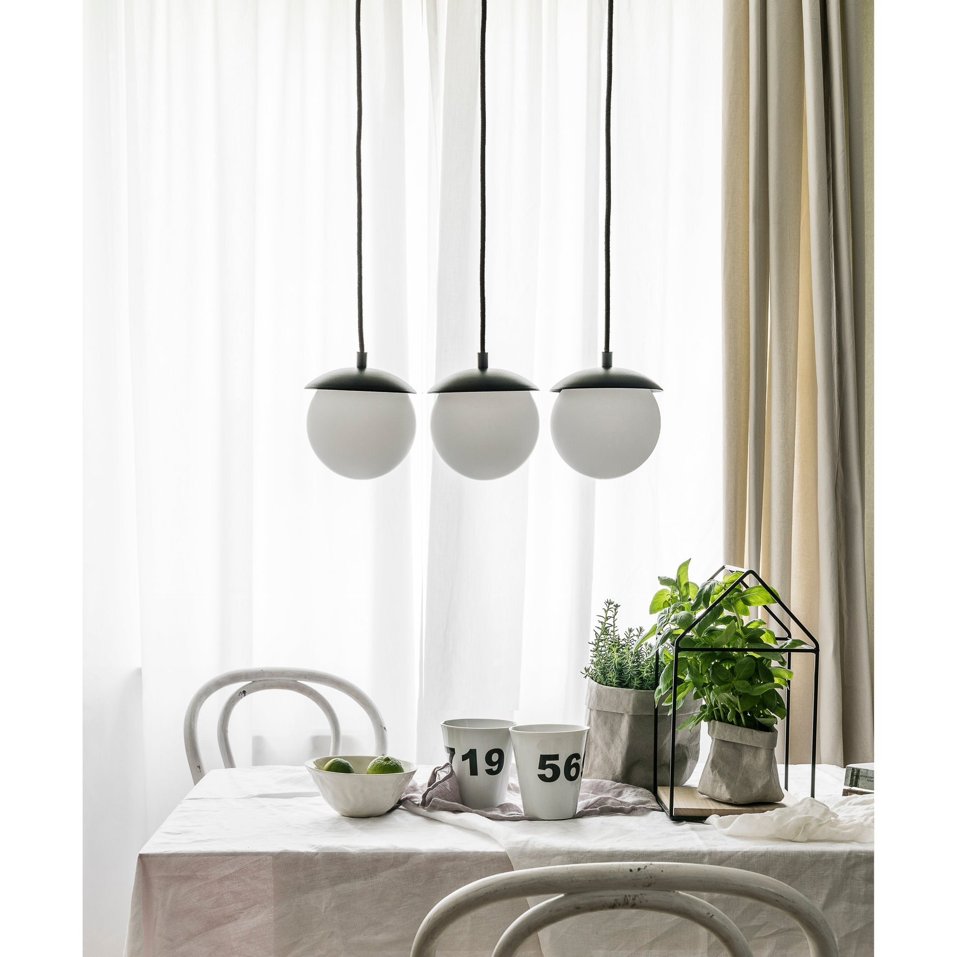 Nowoczesna, czarna lampa wisząca na listwie, trzy mleczne szklane kule (śr. 3x15cm) w czapeczkach, pasuje do wnętrz klasycznych o nowoczesnym charakterze, industrialnych, eklektycznych, łączących różne style, przemyślane dekoracyjne elementy i jakościowy dobór materiałów.