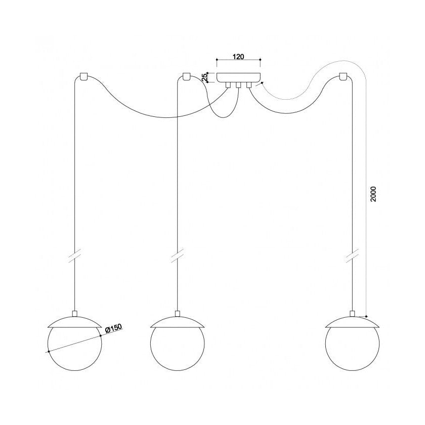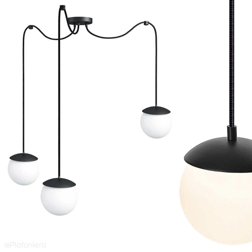 Nowoczesna, czarna lampa wisząca na kablach podpiętych do sufitu jak nogi pająka, trzy mleczne szklane kule (śr. 3x15cm), w czapeczkach, pasuje do wnętrz klasycznych o nowoczesnym charakterze, industrialnych, eklektycznych, łączących różne style, przemyślane dekoracyjne elementy i jakościowy dobór materiałów.