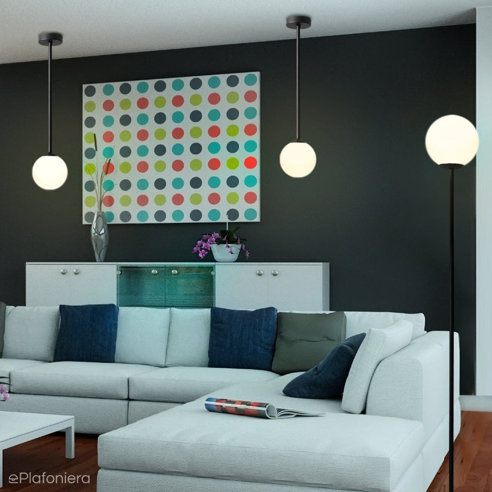 Nowoczesna lampa podłogowa, oryginalna i zarazem minimalistyczna na nodze – rurce i okrągłej podstawie w kolorze czarnym - biała, szklana kula.