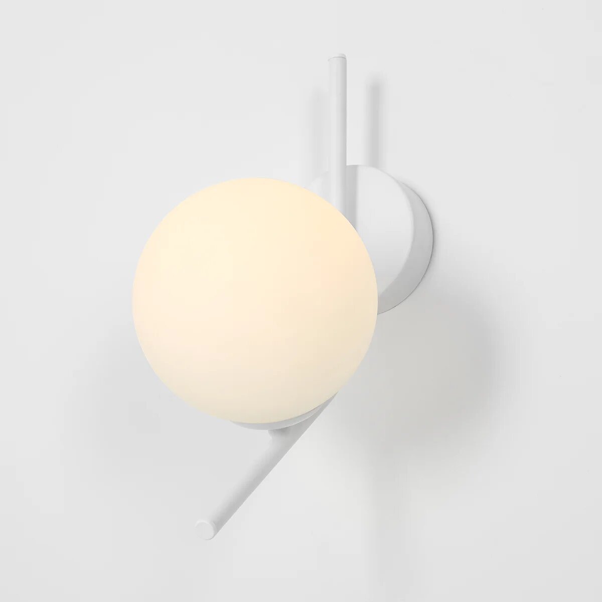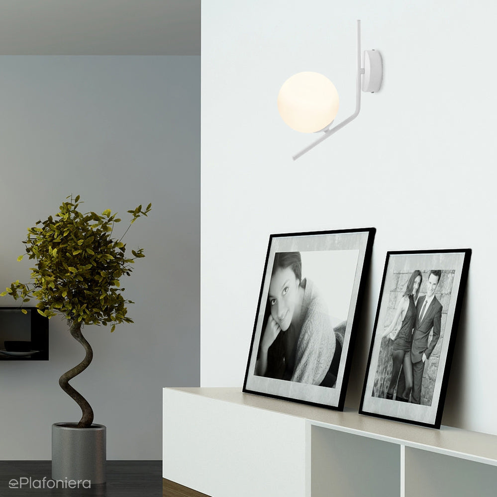 Nowoczesna, designerska lampa ścienna, jeden mleczny klosz o średnicy 14 cm umieszczony na białej wygiętej rurce.