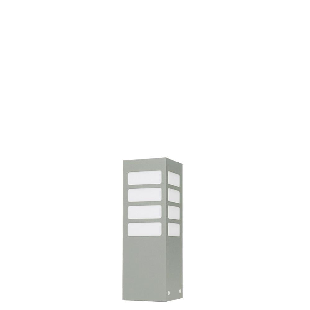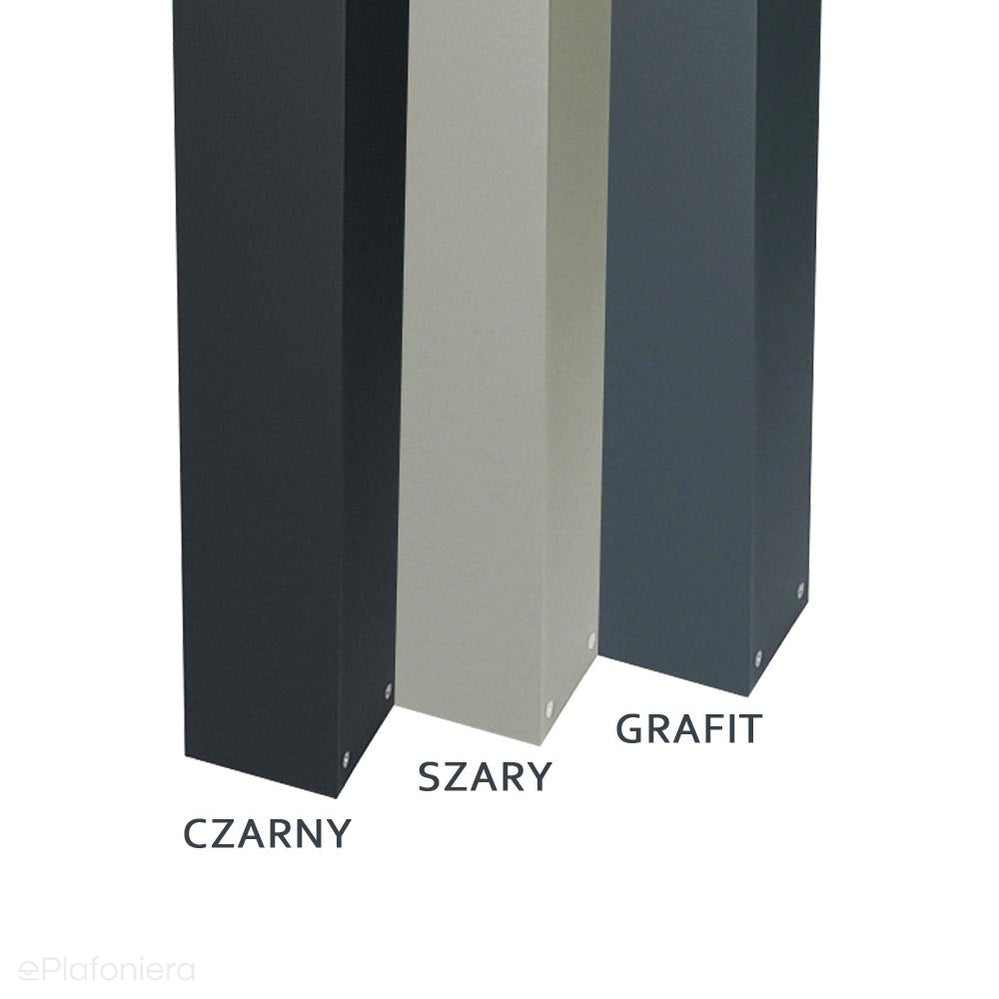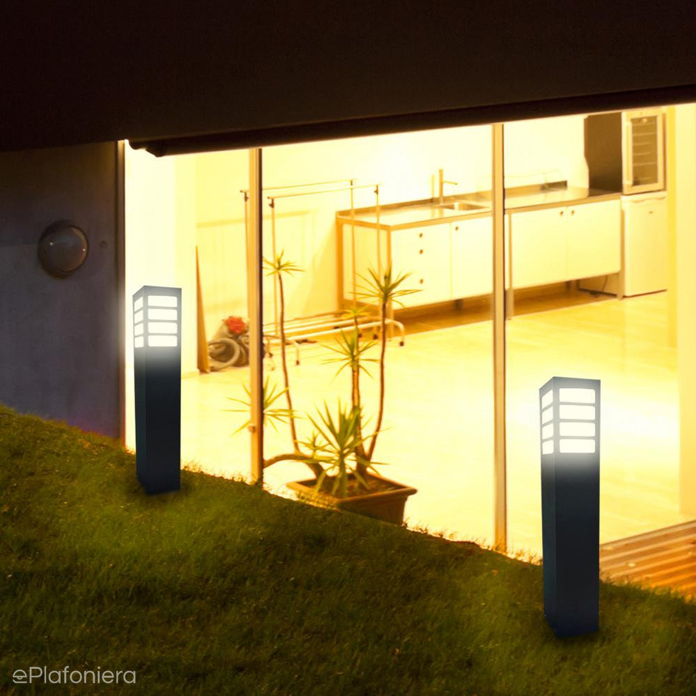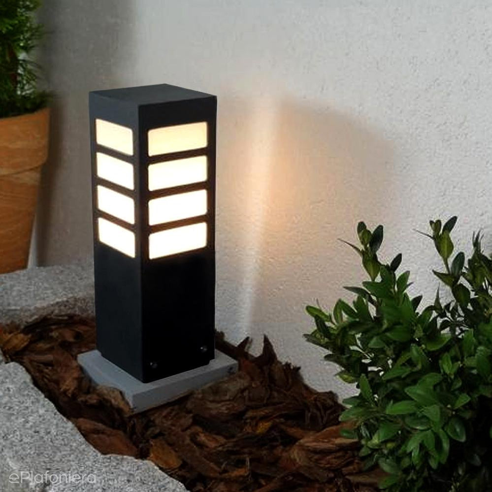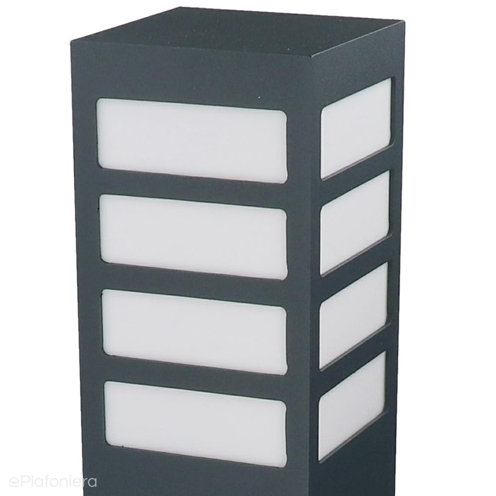 Klasyczna lampa stojąca zewnętrzna o IP 44, produkowana w kolorze grafitowym, czarnym lub szarym. Aluminiowy słupek malowany proszkowo z mlecznym kloszem z poliwęglanu o wymiarach – wysokość 30cm / 55cm lub 75cm, o przekroju 10cm x 10cm.