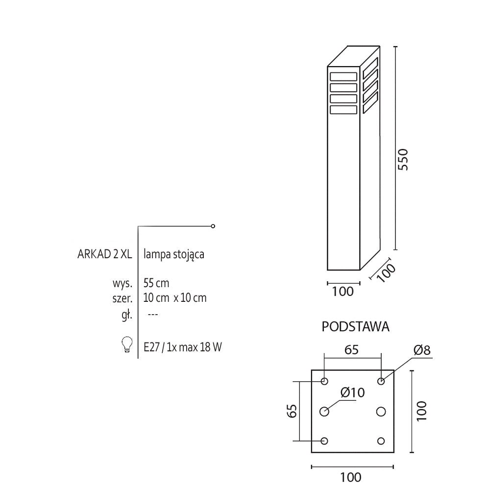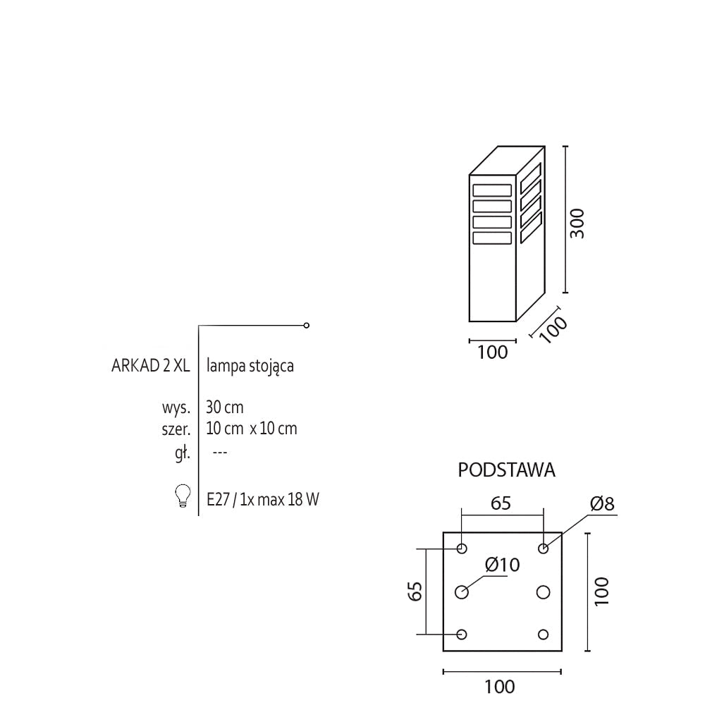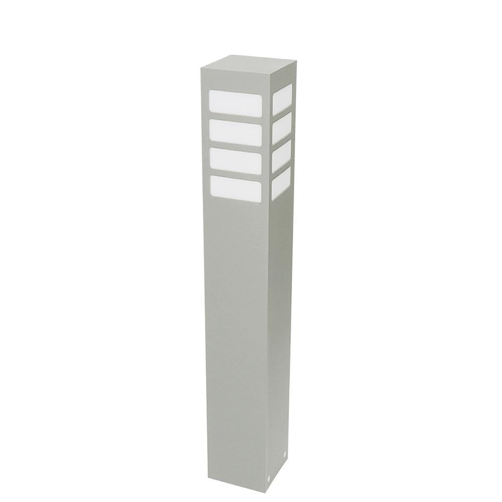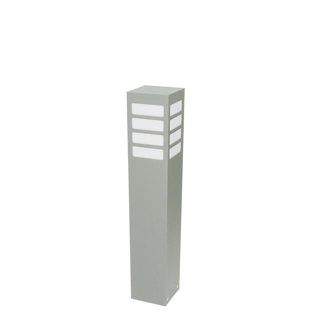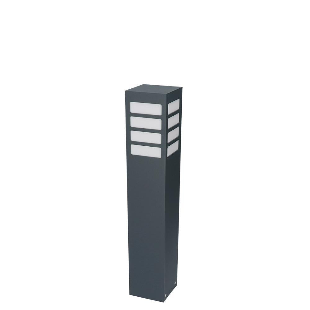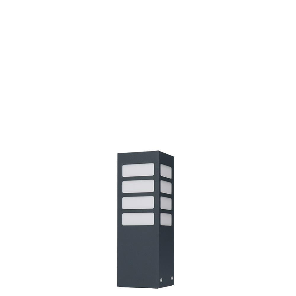 Klasyczna lampa stojąca zewnętrzna o IP 44, produkowana w kolorze grafitowym, czarnym lub szarym. Aluminiowy słupek malowany proszkowo z mlecznym kloszem z poliwęglanu o wymiarach – wysokość 30cm / 55cm lub 75cm, o przekroju 10cm x 10cm.
