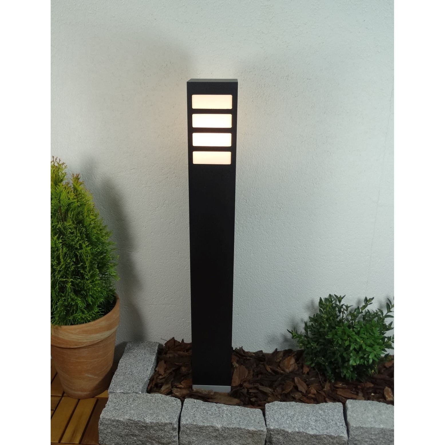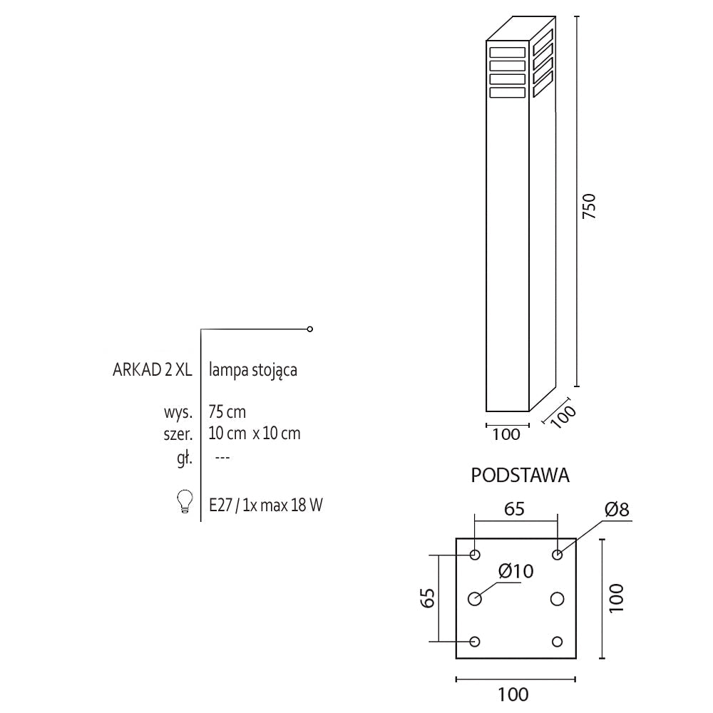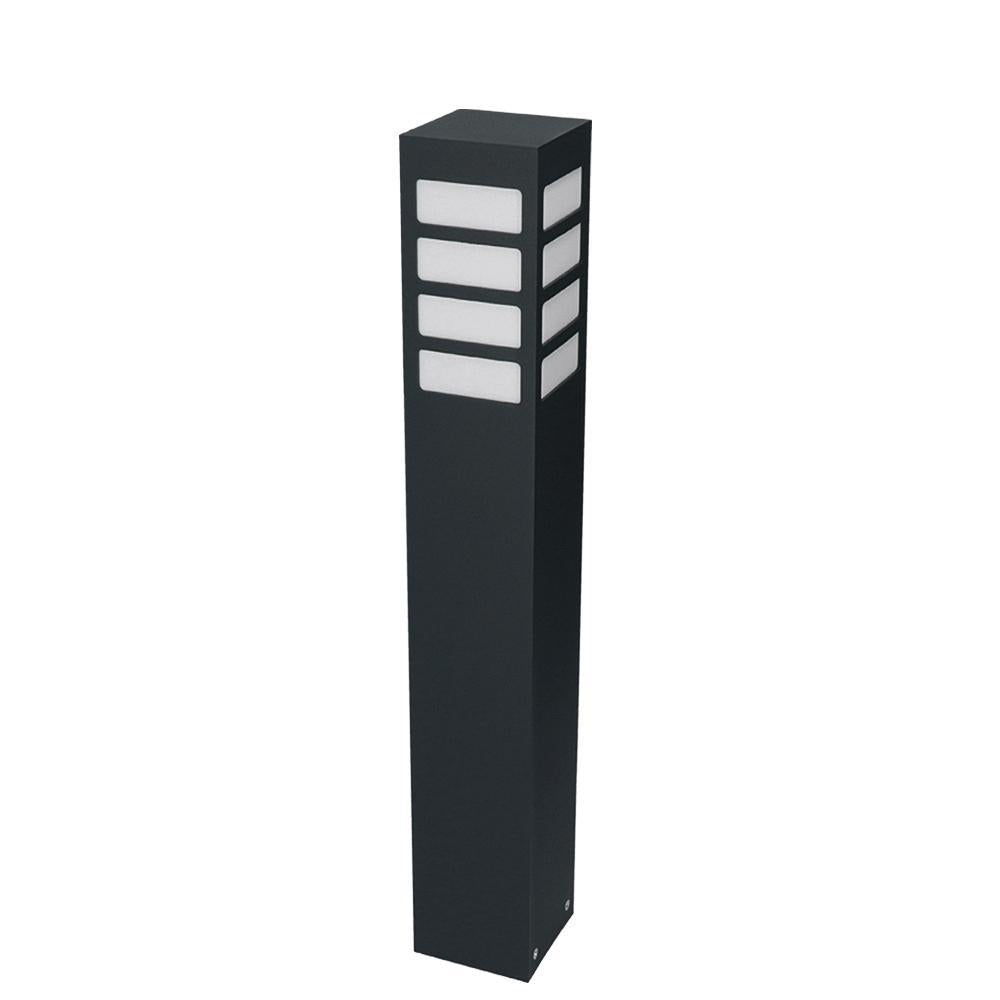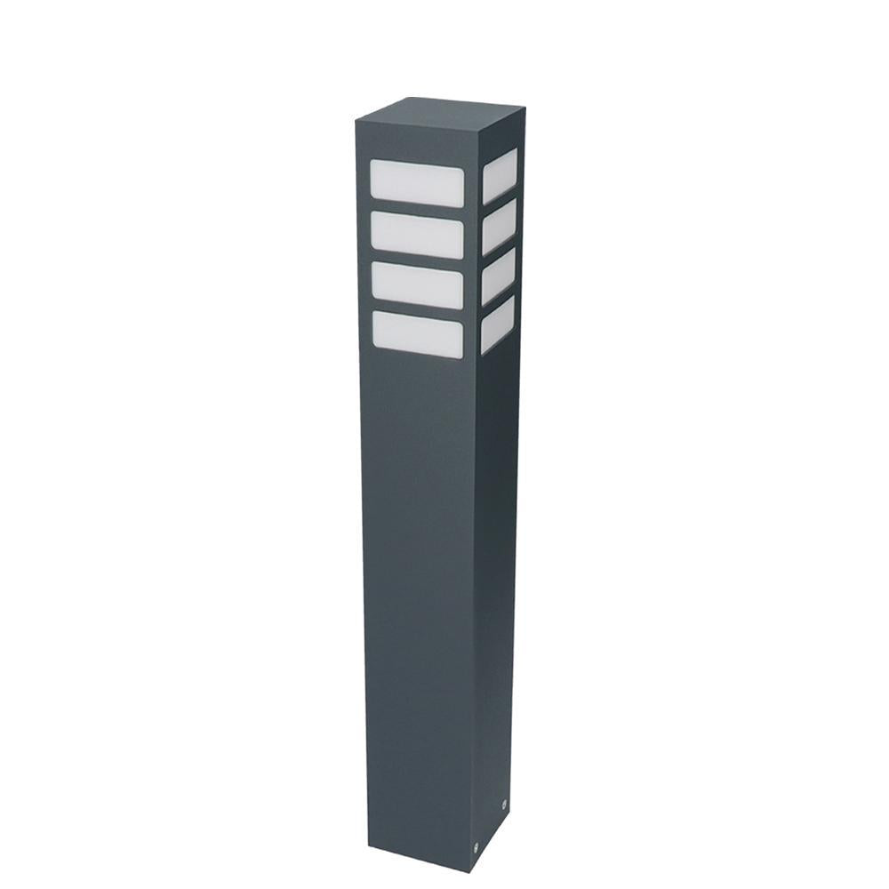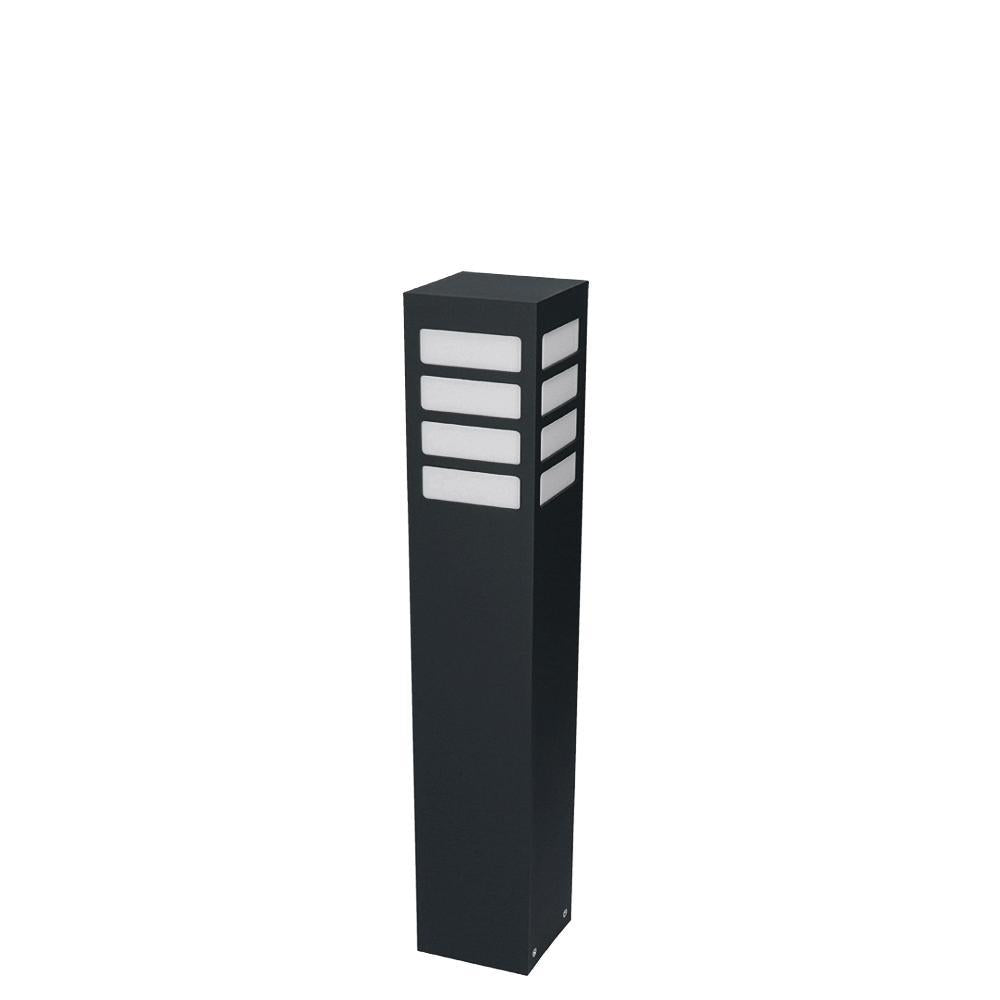 Klasyczna lampa stojąca zewnętrzna o IP 44, produkowana w kolorze grafitowym, czarnym lub szarym. Aluminiowy słupek malowany proszkowo z mlecznym kloszem z poliwęglanu o wymiarach – wysokość 30cm / 55cm lub 75cm, o przekroju 10cm x 10cm.