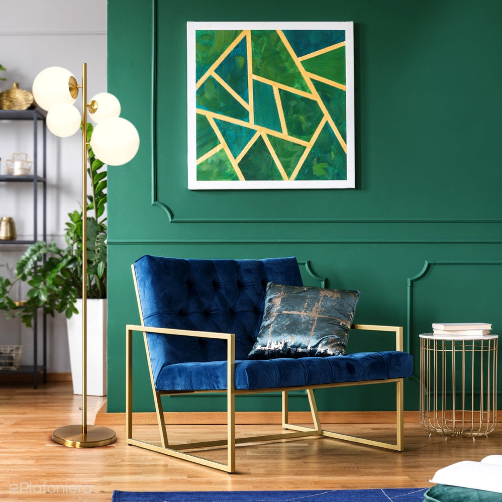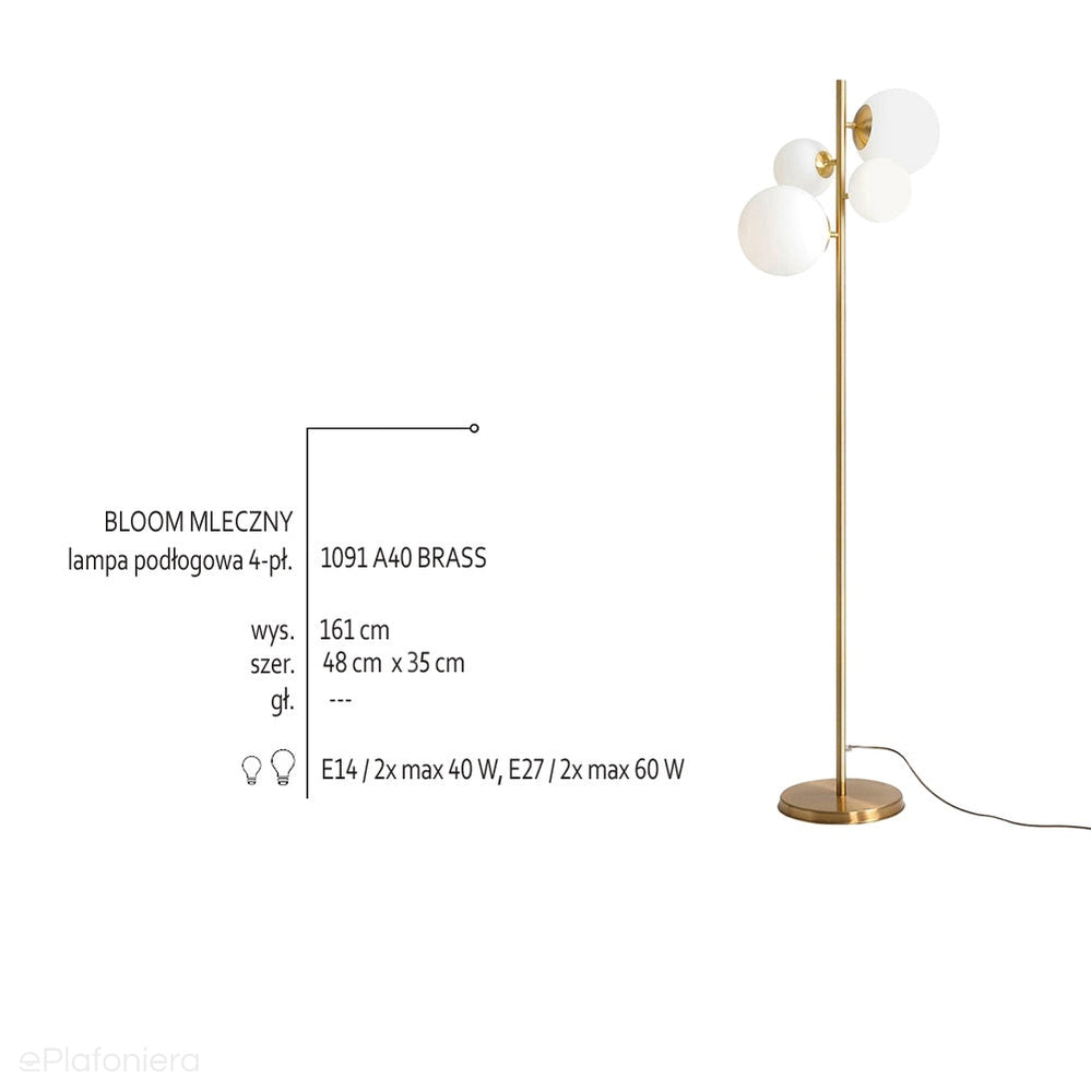 Nowoczesna lampa podłogowa na jednej nodze - mosiężna metalowa rurka, na której umieszczono cztery mleczne, satynowe klosze – kule o średnicy 14cm i 20cm.