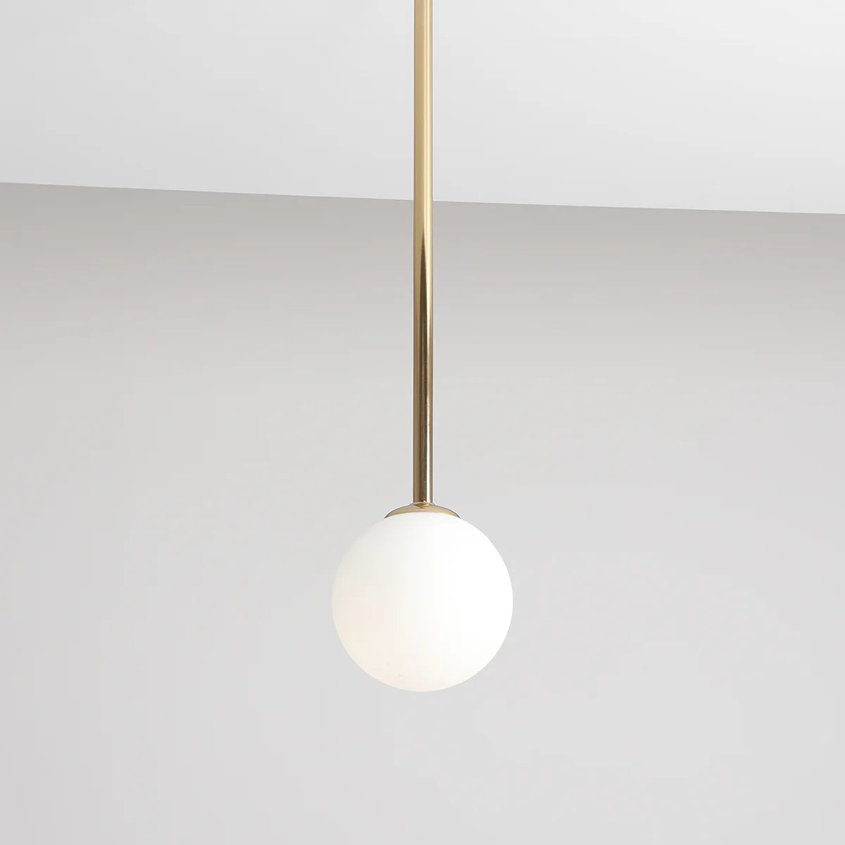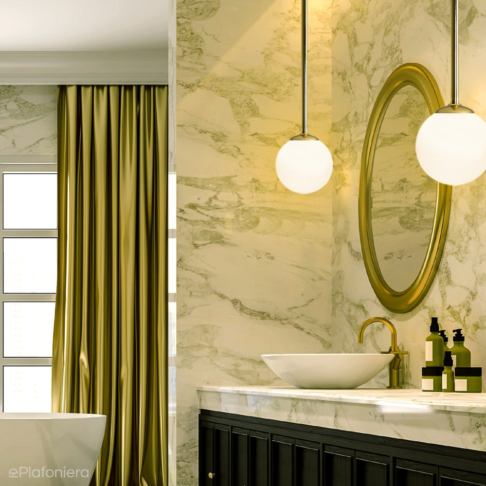 Nowoczesna lampa sufitowa, oryginalna i zarazem minimalistyczna plafoniera na średnim drążku w kolorze złotym - biała, mała, szklana kula.
