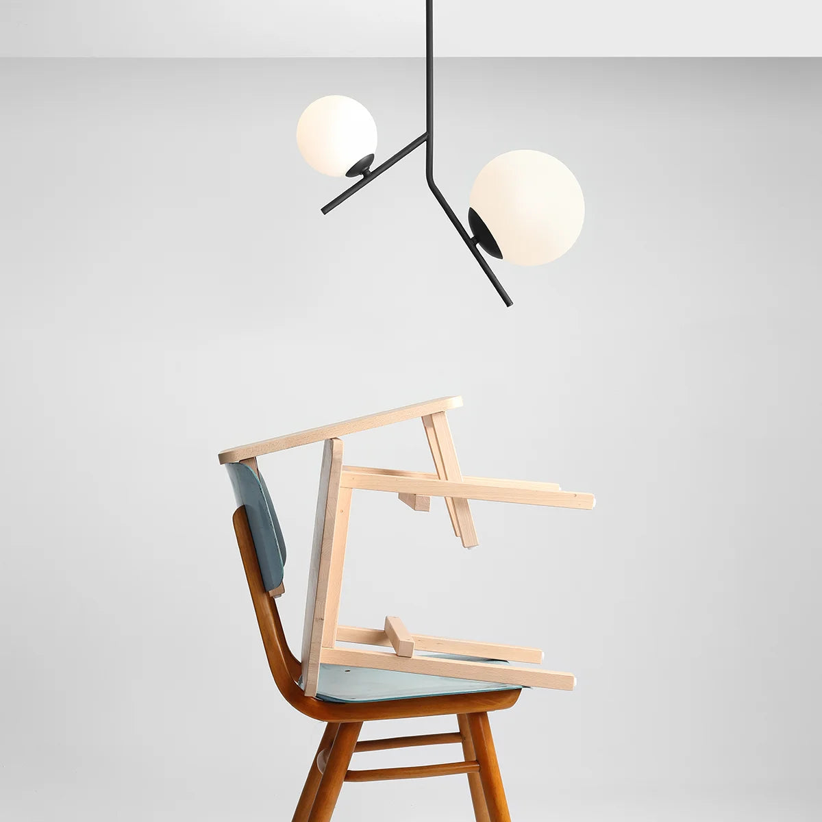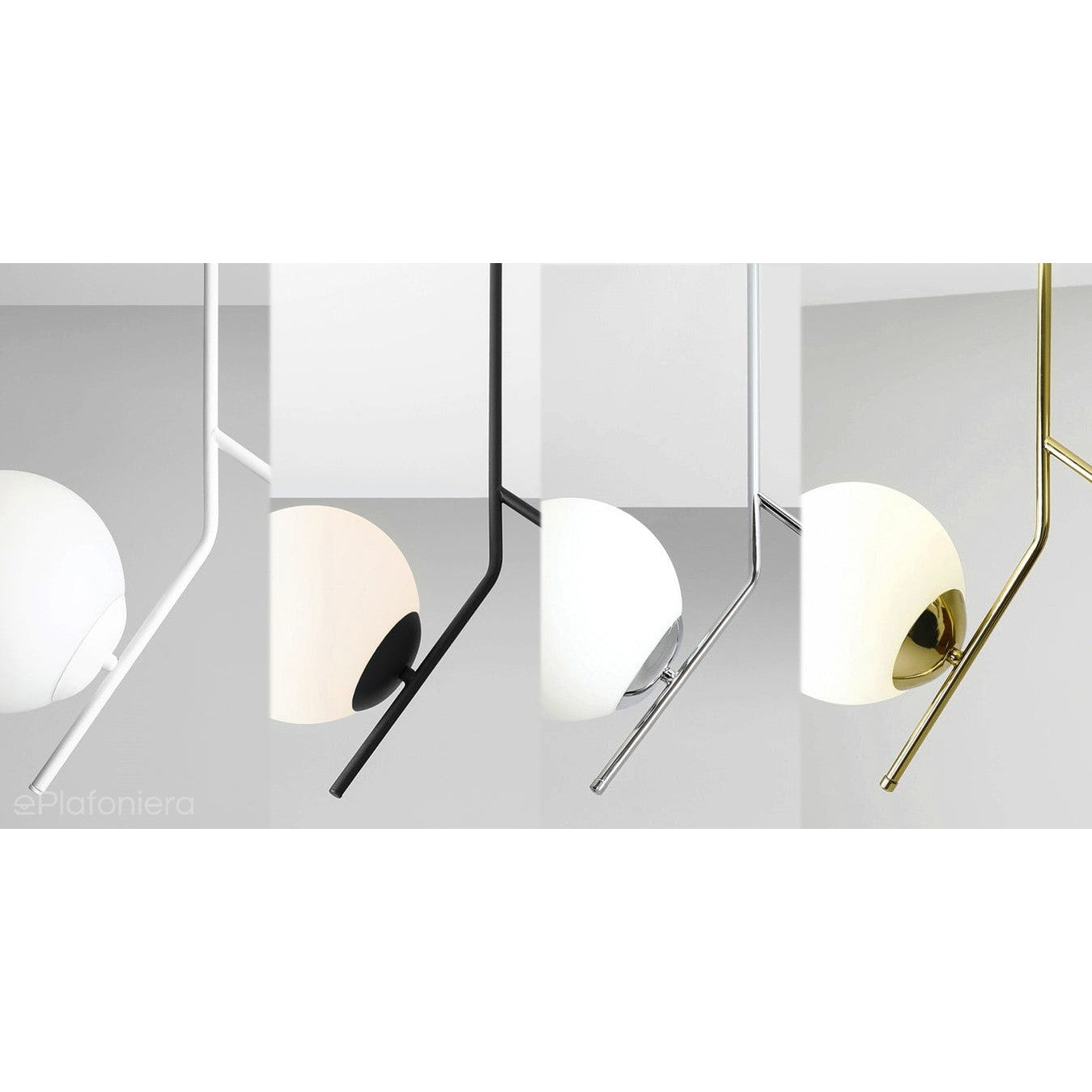 Nowoczesna, designerska lampa sufitowa, dwa mleczne klosze o średnicy 14 cm i 20 cm umieszczone na czarnych wygiętych rurkach.