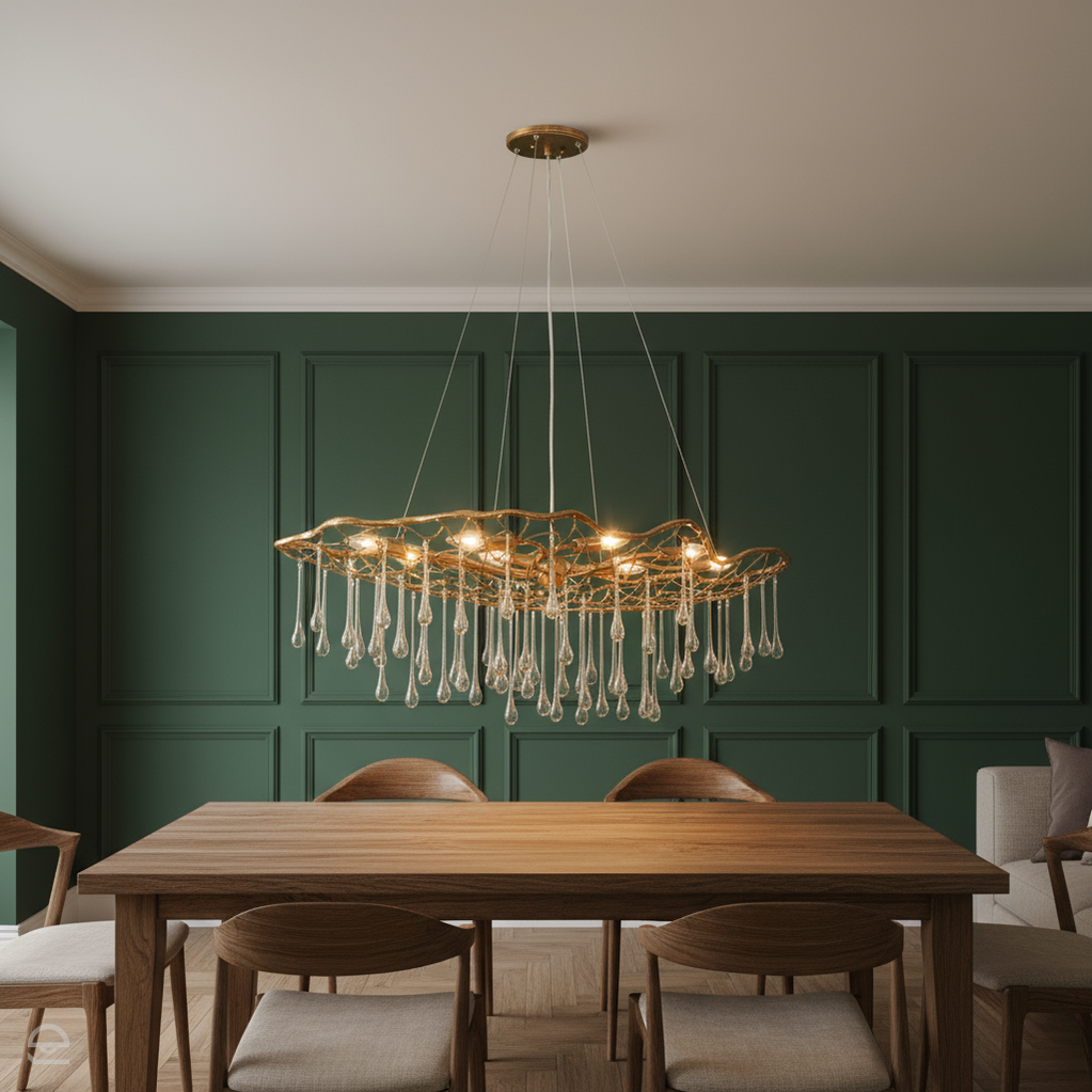 Wyobraź sobie sieć rybacką, która powoli i delikatnie wynurza się na powierzchnię, ociekając kaskadą mieniących się w świetle kropelek wody. W kolekcji Laguna bazą tej artystycznej interpretacji jest ręcznie wykonana, misterna rama wykończona w kolorze oksydowanego złota. Krople z przezroczystego szkła są różnej długości i pięknie rozpraszają światło. Minimalistyczne, prawie niewidoczne metalowe linki użyte do podwieszenia konstrukcji tworzą efekt, w którym sieć wydaje się samodzielnie unosić w powietrzu, a delikatnie zamaskowane źródła światła emitują blask od wewnątrz.