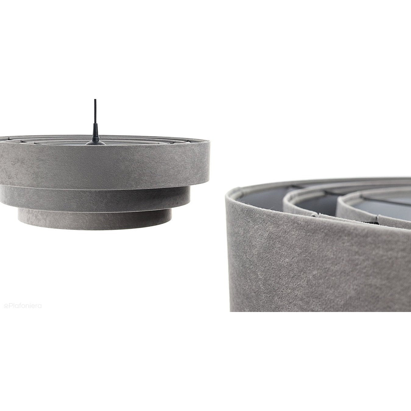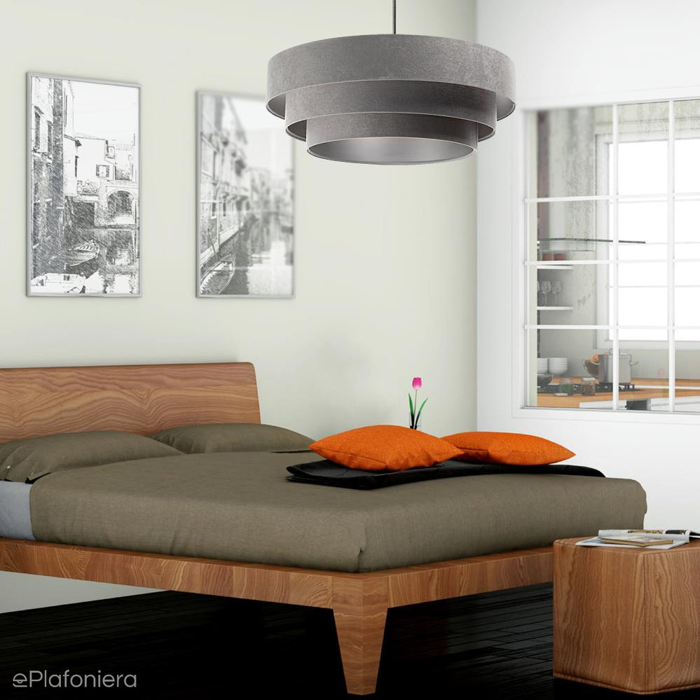 Welurowa lampa wisząca w stylu nowoczesnym oraz minimalistycznym , trzy współśrodkowe walce. Na zewnątrz walec jest pokryty welurem, a wewnątrz tworzywem sztucznym odbijającym światło.