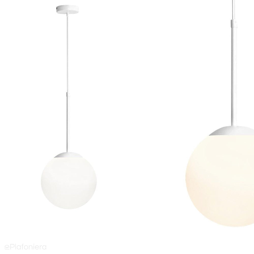 Nowoczesna lampa jednopunktowa, biała z małą białą, satynową, szklaną kulą o średnicy 20cm.