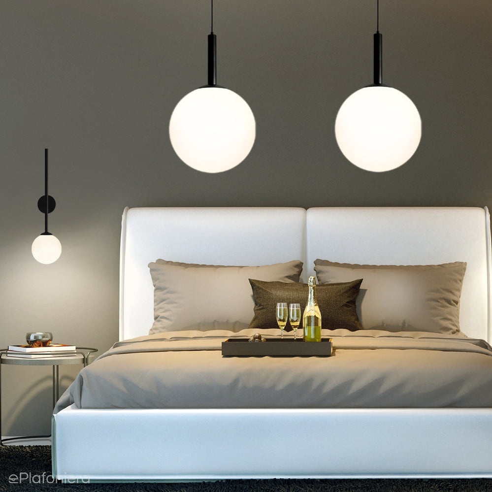 Nowoczesna lampa jednopunktowa, czarna z małą białą, satynową, szklaną kulą o średnicy 40cm.