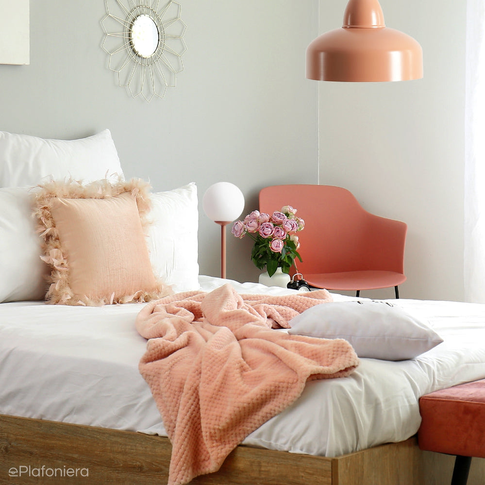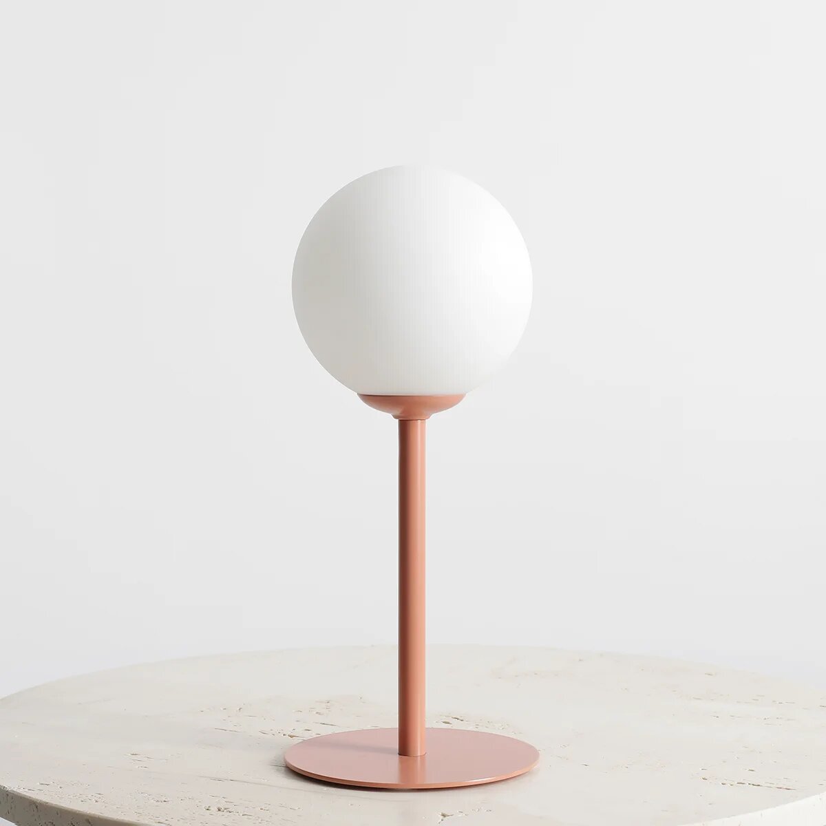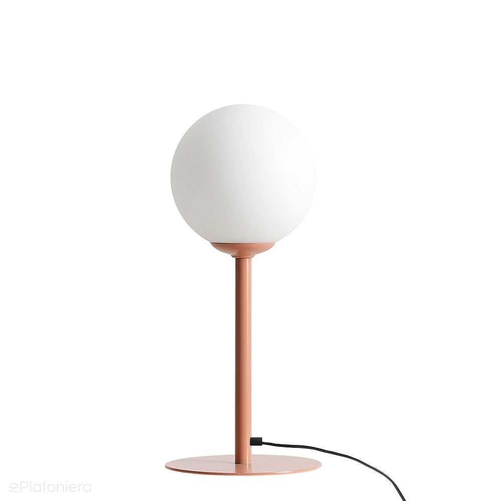 Nowoczesna lampka stołowa na metalowej nodze w kolorze koralowym na okrągłej podstawie z białym kloszem - kulą to ciekawe rozwiązanie na dodatkowe i designerskie oświetlenie w salonie, biurze lub sypialni, na biurko, stolik nocny, stolik kawowy, na parapet okna, na komodę.