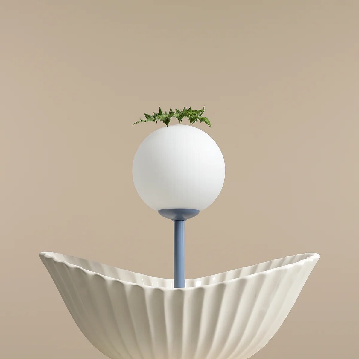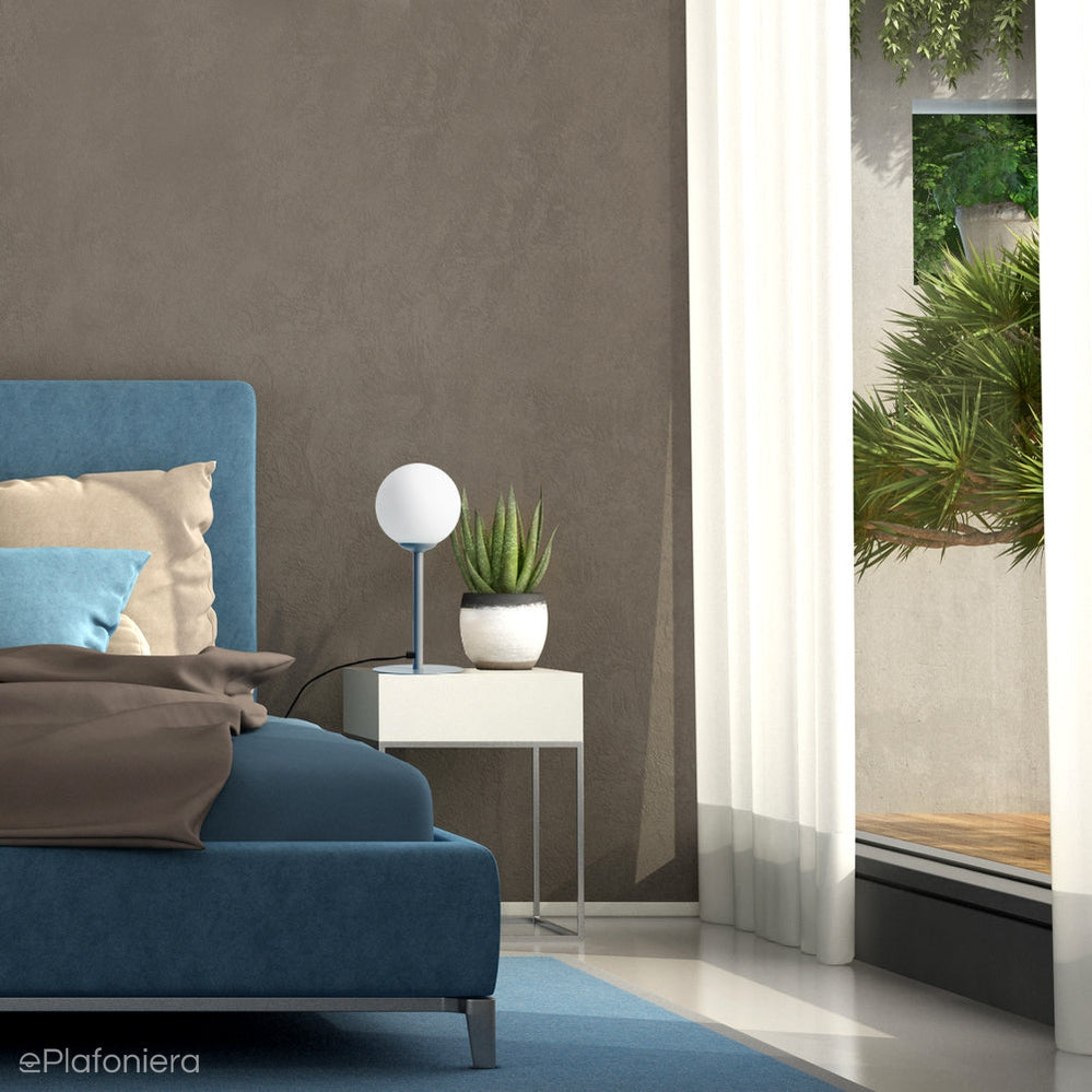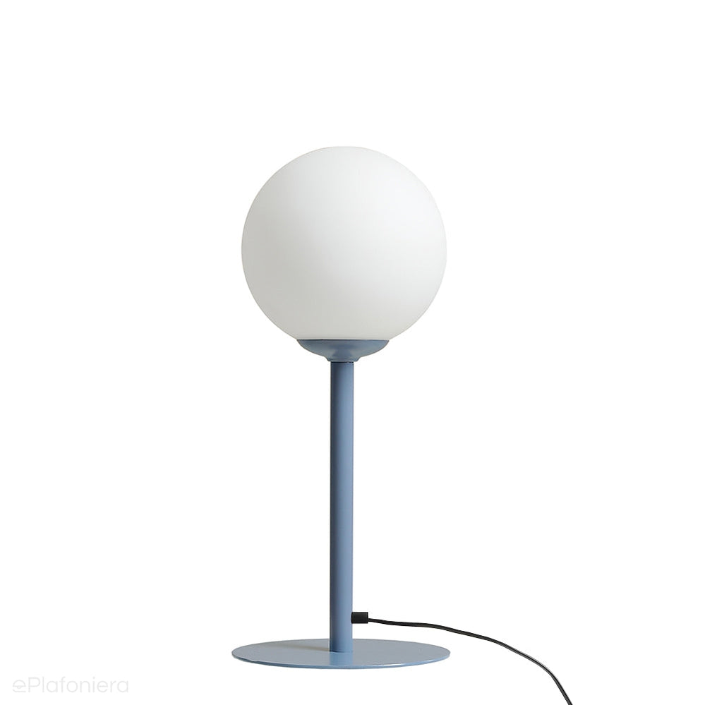 Nowoczesna lampka stołowa na metalowej nodze w kolorze niebieskim na okrągłej podstawie z białym kloszem - kulą to ciekawe rozwiązanie na dodatkowe i designerskie oświetlenie w salonie, biurze lub sypialni, na biurko, stolik nocny, stolik kawowy, na parapet okna, na komodę.