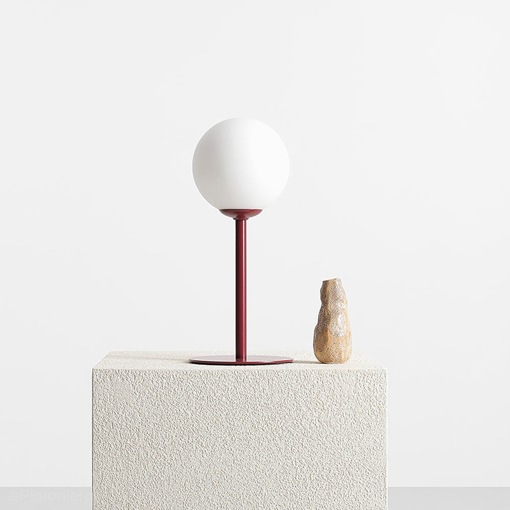 Nowoczesna lampka stołowa na metalowej nodze w kolorze bordowym / czerwonym na okrągłej podstawie z białym kloszem - kulą to ciekawe rozwiązanie na dodatkowe i designerskie oświetlenie w salonie, biurze lub sypialni, na biurko, stolik nocny, stolik kawowy, na parapet okna, na komodę.
