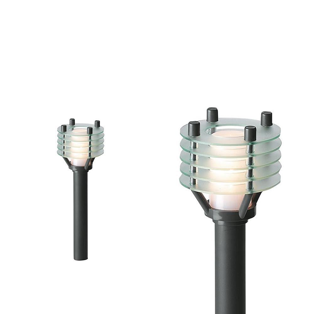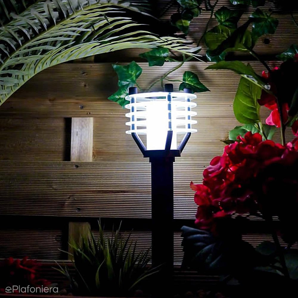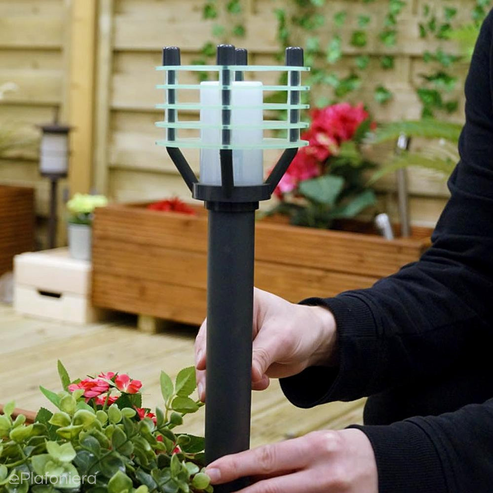 Nowoczesna, czarna lampa stojąca ogrodowa, zewnętrzna o IP 44, słupek wysokości 31cm. Słupek o pomysłowym kształcie przypominającym pochodnię, wykonany z trwałego tworzywa HDPE. U góry zakończony mlecznym kloszem z poliamidu sprawdzi się w ogrodzie, na podjeździe do domu, przy garażu, oświetli wejście do domu, ścieżkę, alejkę parkową, ciągi komunikacyjne.