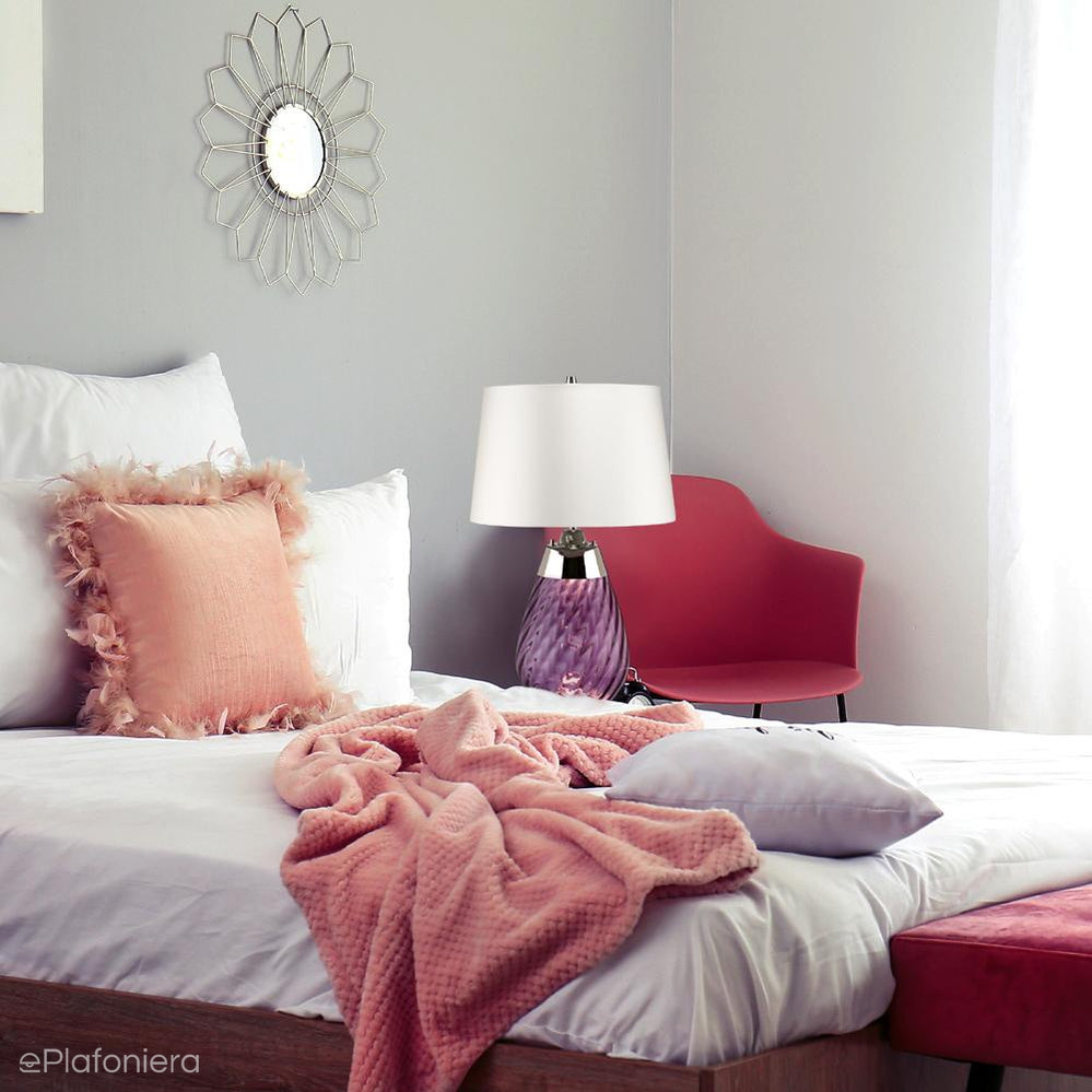 Nowoczesna lampa stołowa, w unikalnym kształcie zdobiona szklana podstawa w śliwkowym kolorze, niklowane elementy metalowe oraz biały satynowy abażur tworzą niebanalną, elegancką całość.