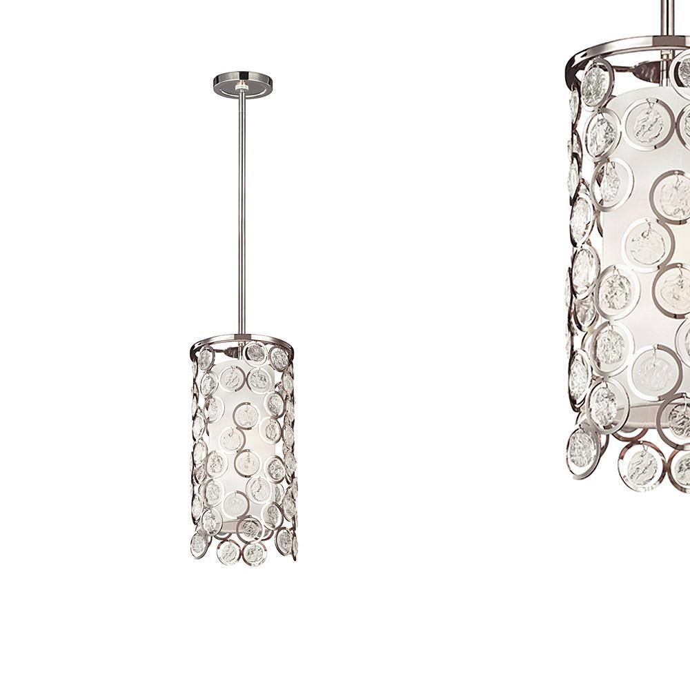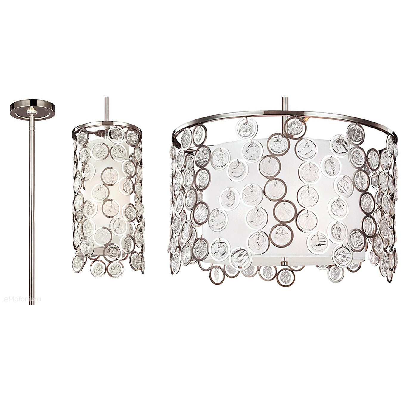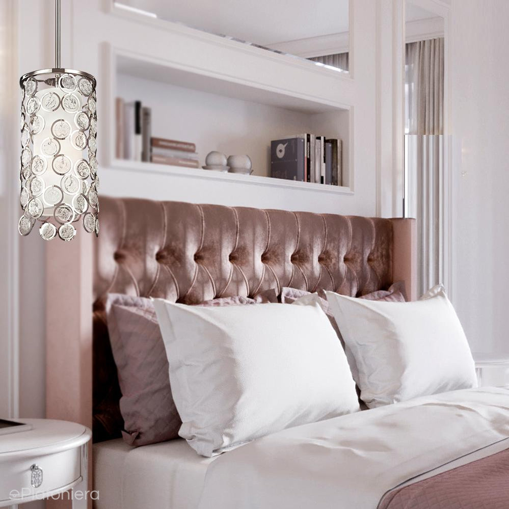 Nowoczesna lampa wisząca na jedną żarówkę, luksusowa, glamour, nowojorska, biały abażur - walec z jedwabiu Szantung, który posiada szklane dyfuzory zmiękczające światło.