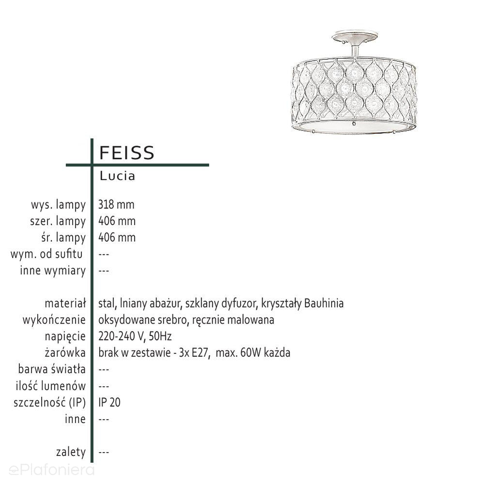 Kryształowa lampa sufitowa 40cm, ręcznie malowana (oksydowane srebro) do sypialni salonu (3xE27) Feiss (lucia)