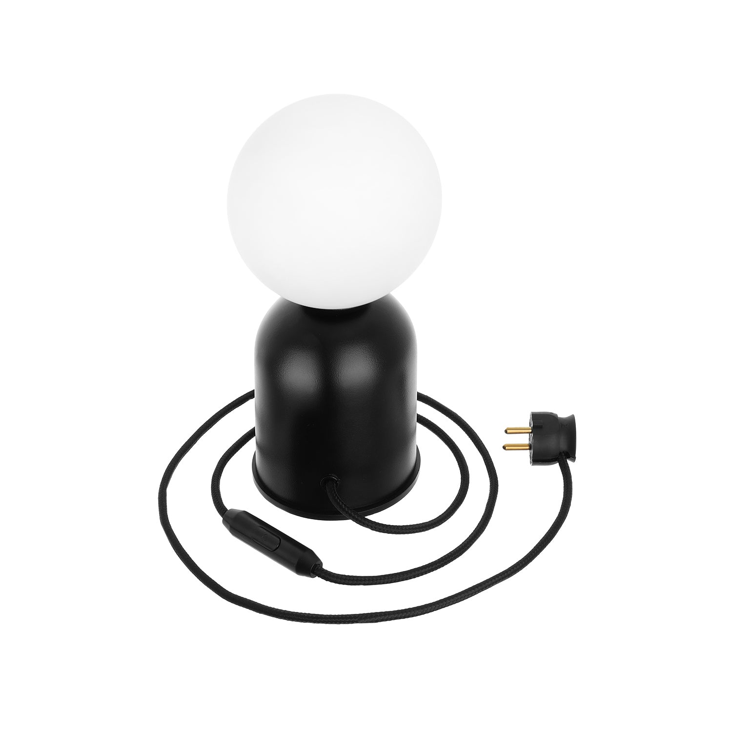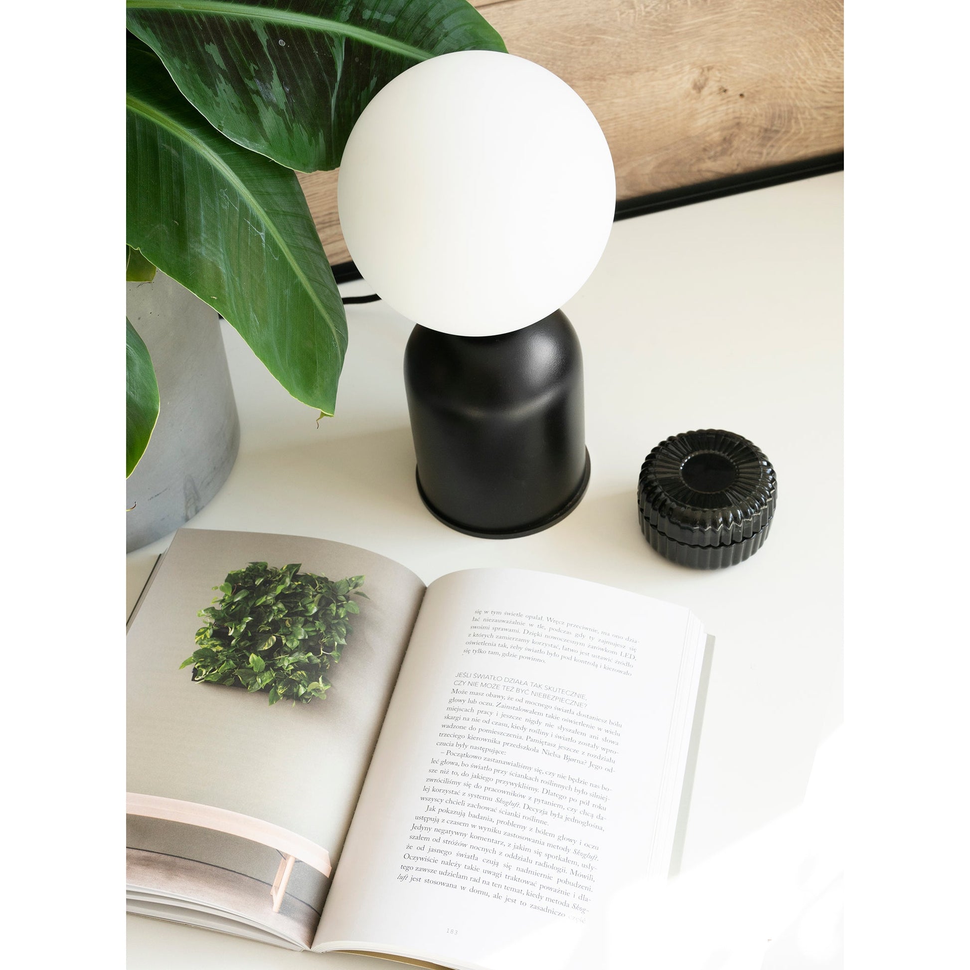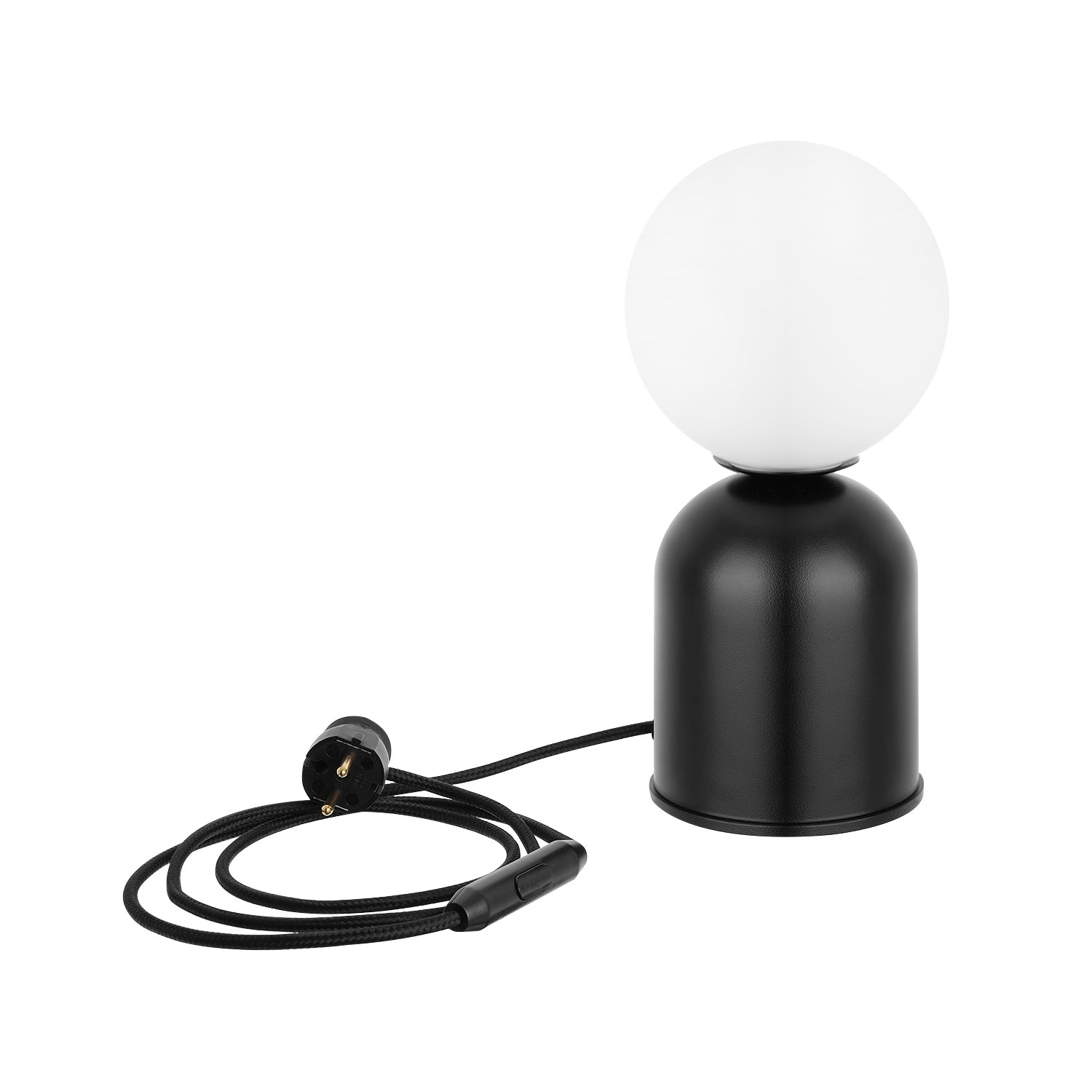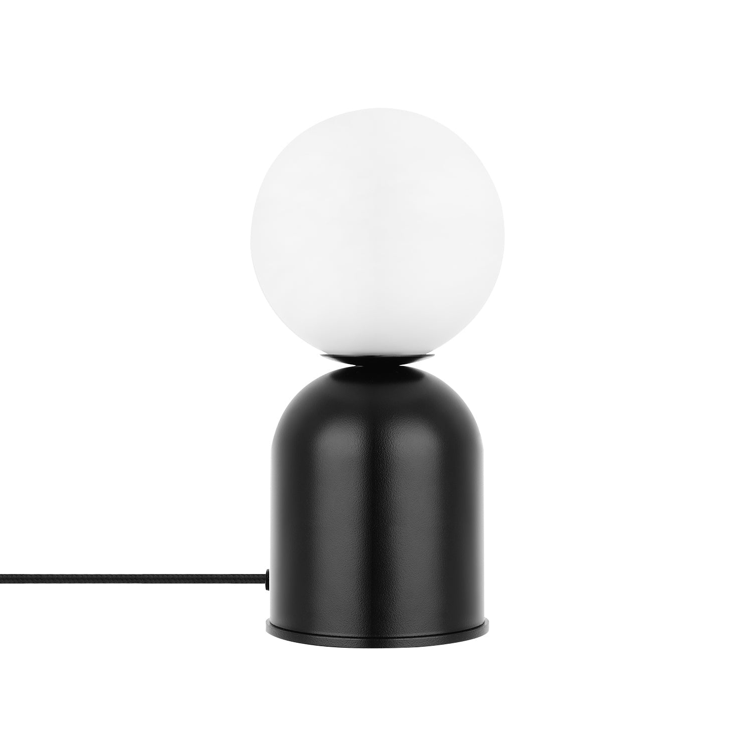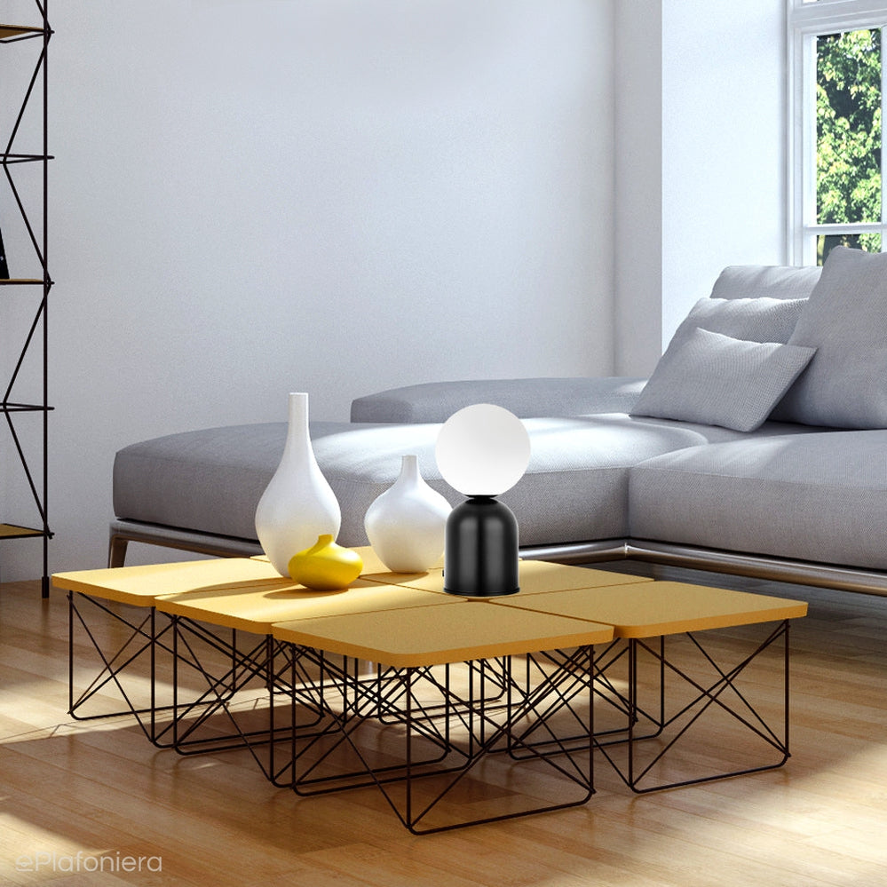 Nowoczesna lampa stołowa, stojąca, bardzo designerska, czarna podstawa z białym, matowym, szklanym kloszem – kulą, do biura, salonu, sypialni, przedpokoju, jako oświetlenie boczne, do czytania, nauki, pracy, na biurko, stół, szafki nocne, komody, na parapet.