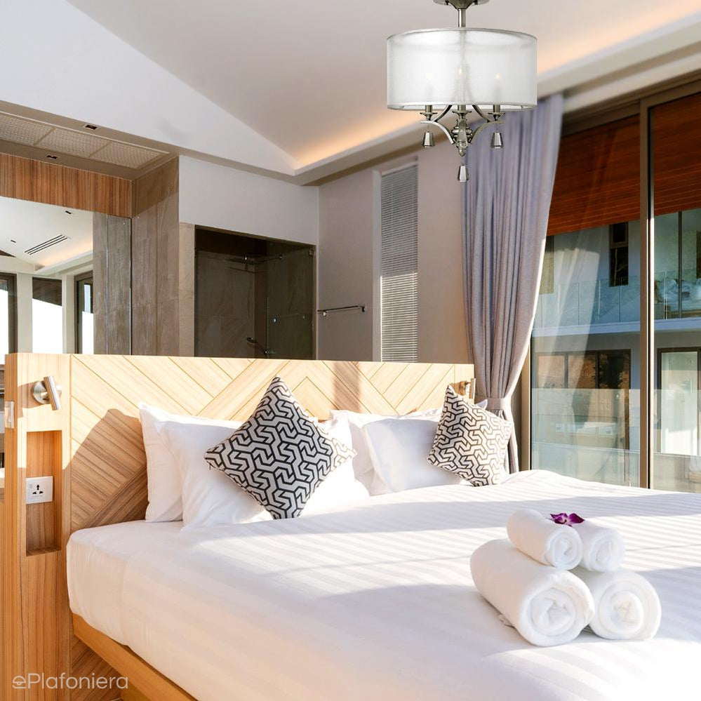 Nowoczesny żyrandol - plafoniera, elegancka, niklowana, dekoracyjna rama zakończona kryształami z półprzezroczystym abażurem – walcem, zakrywającym trzy żarówki.