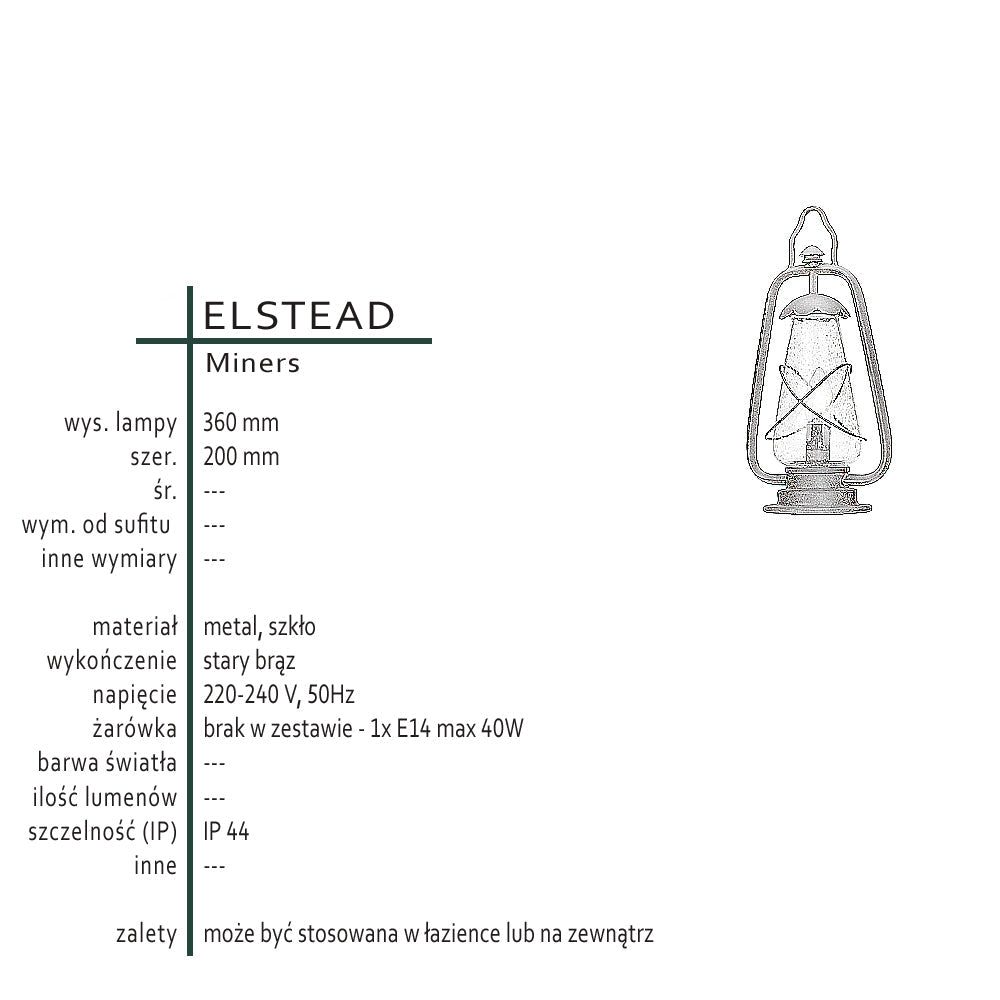 Zewnętrzna latarnia, metalowa lampa stojąca, 1xE14 Elstead (Miners)