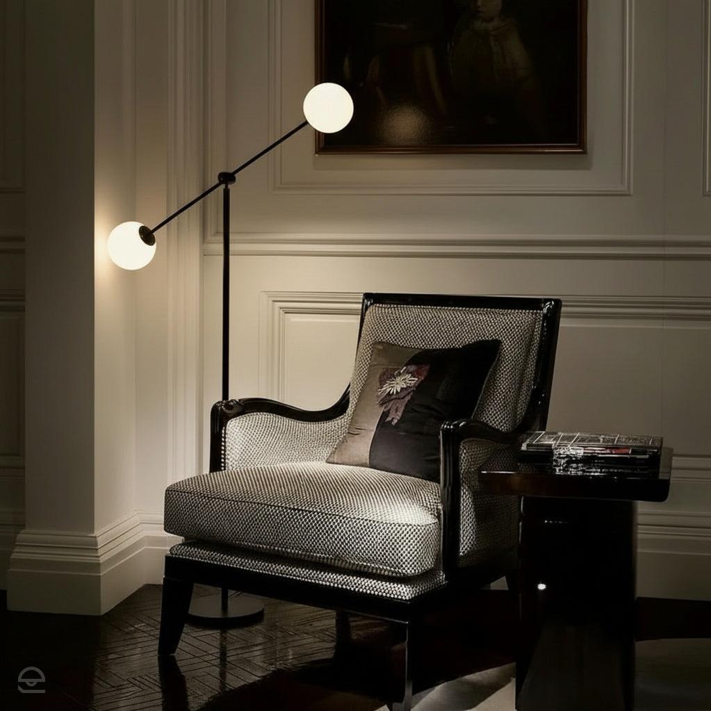 Nowoczesna, o bardzo modnym wyglądzie lampa stojąca, podłogowa, na czarnej, długiej nodze balansujący pręt zakończony dwiema równoważącymi się białymi, szklanymi kulami.