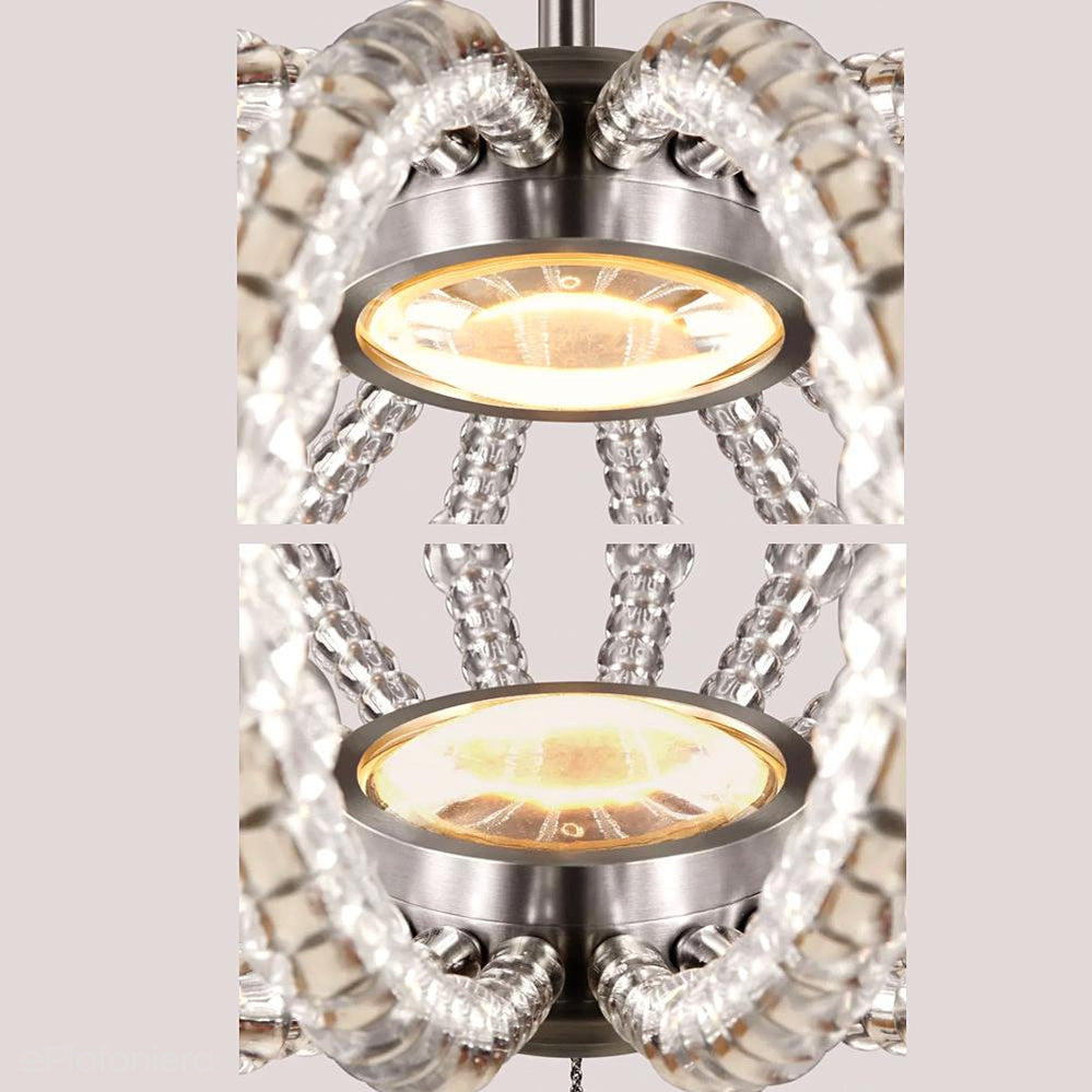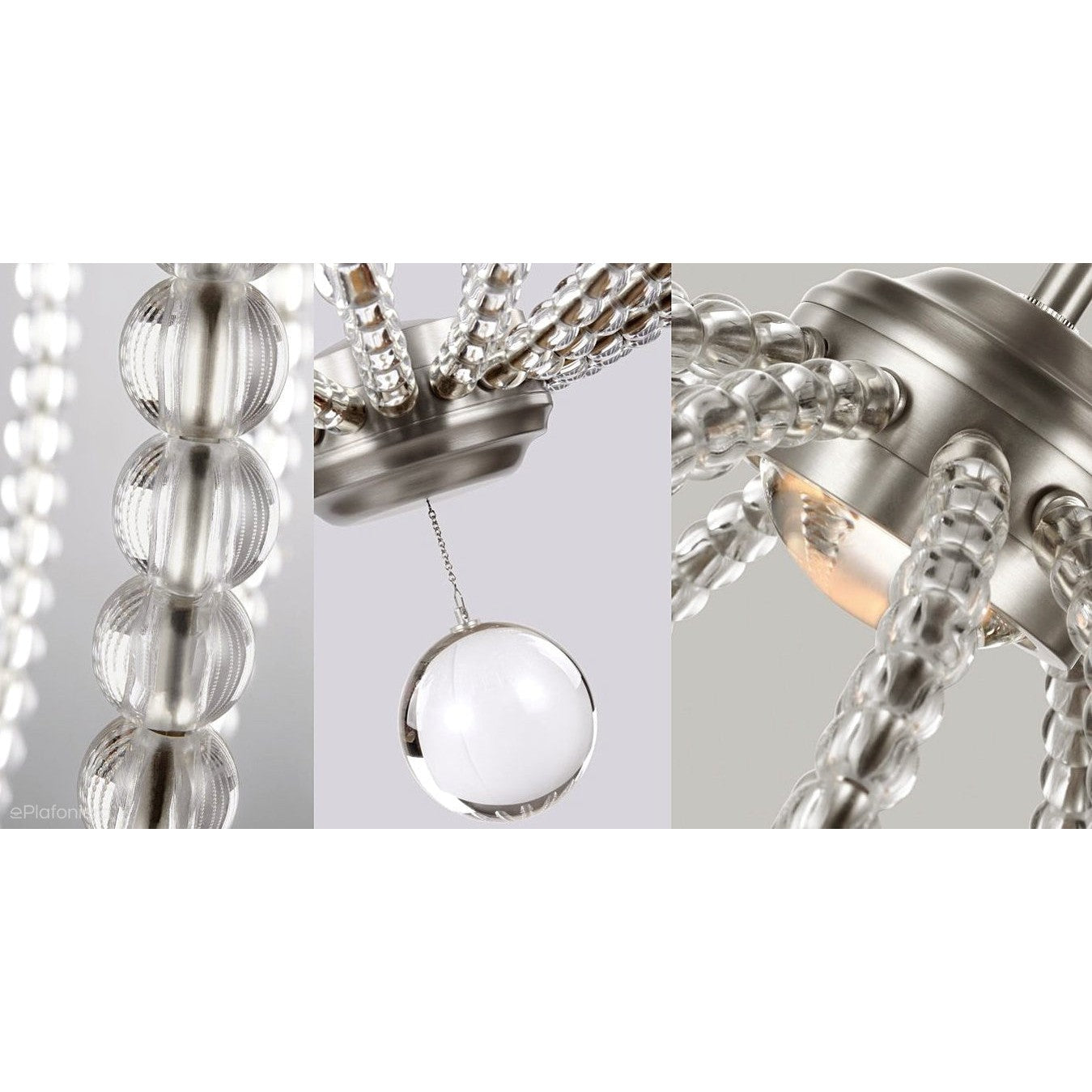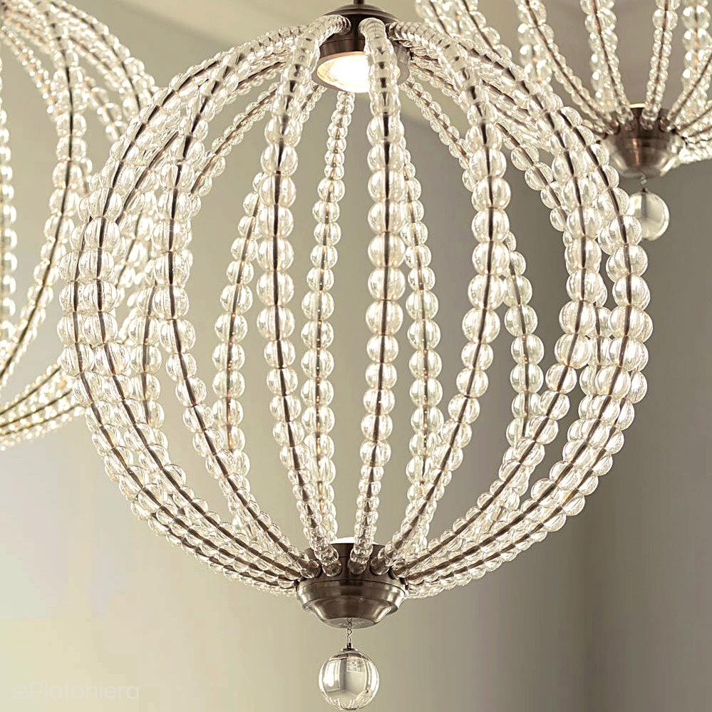 Nowoczesna lampa LED, glamour, szklane (kryształowe), przezroczyste paciorki na niklowanych prętach, ułożone w zwisającą kulę o średnicy 35cm z ozdobnymi detalami, dwa LEDy pięknie podkreślają walory konstrukcji i oświetlą wnętrze.