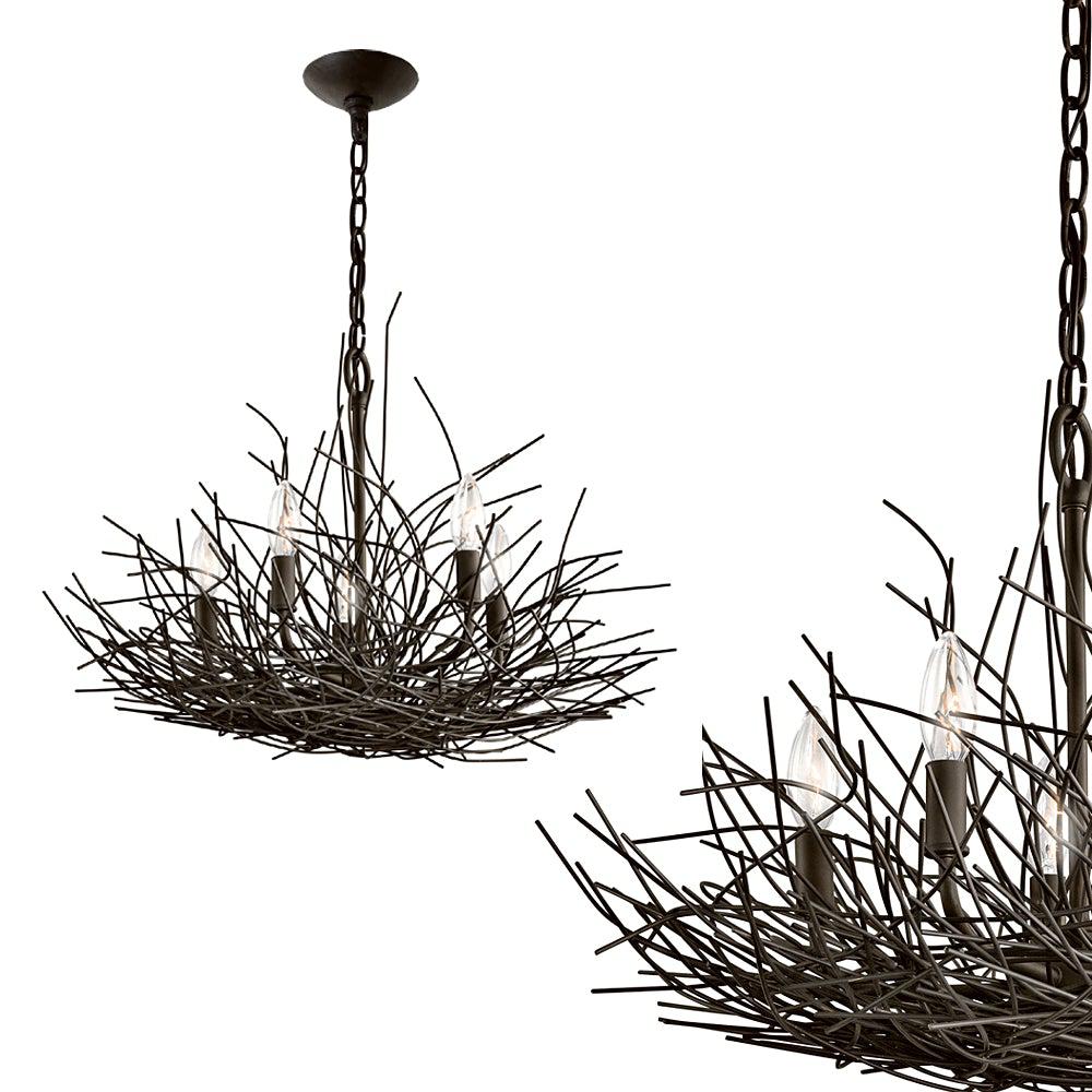 Nowoczesny żyrandol na łańcuchu inspirowany naturą, układ wielu misternie ułożonych stalowych drutów w kolorze starego brązu, gałązek, jakby przed chwilą wyciętych z przerośniętego drzewa na wiosnę, skrywających pięć żarówek - świeczek.
