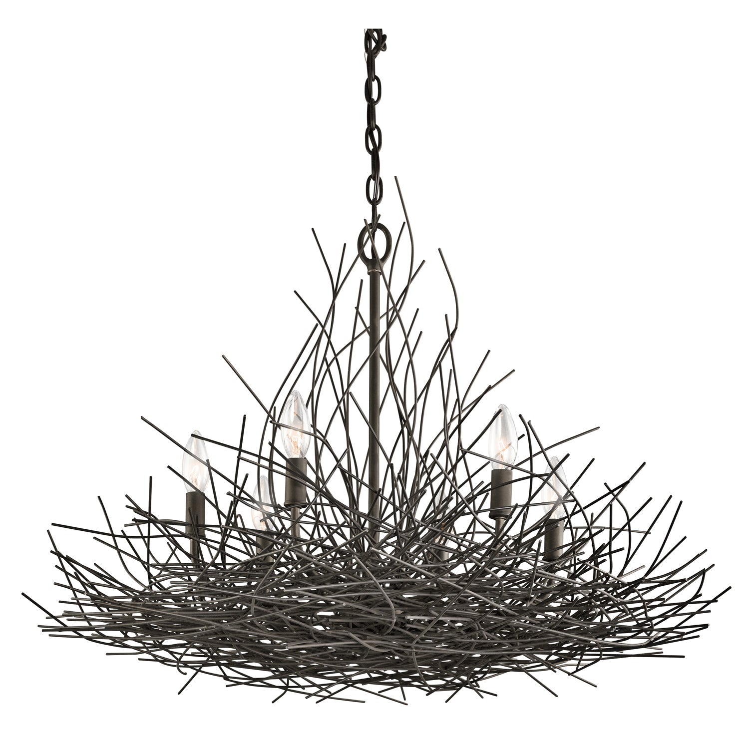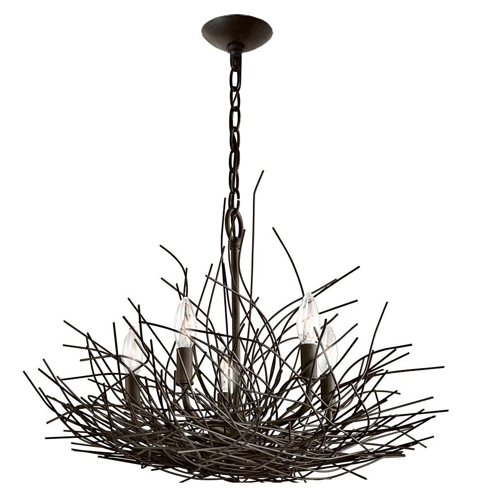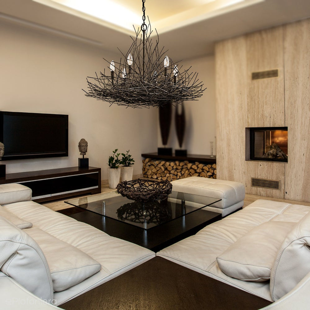 Nowoczesny żyrandol na łańcuchu inspirowany naturą, układ wielu misternie ułożonych stalowych drutów w kolorze starego brązu, gałązek, jakby przed chwilą wyciętych z przerośniętego drzewa na wiosnę, skrywających sześć żarówek - świeczek.