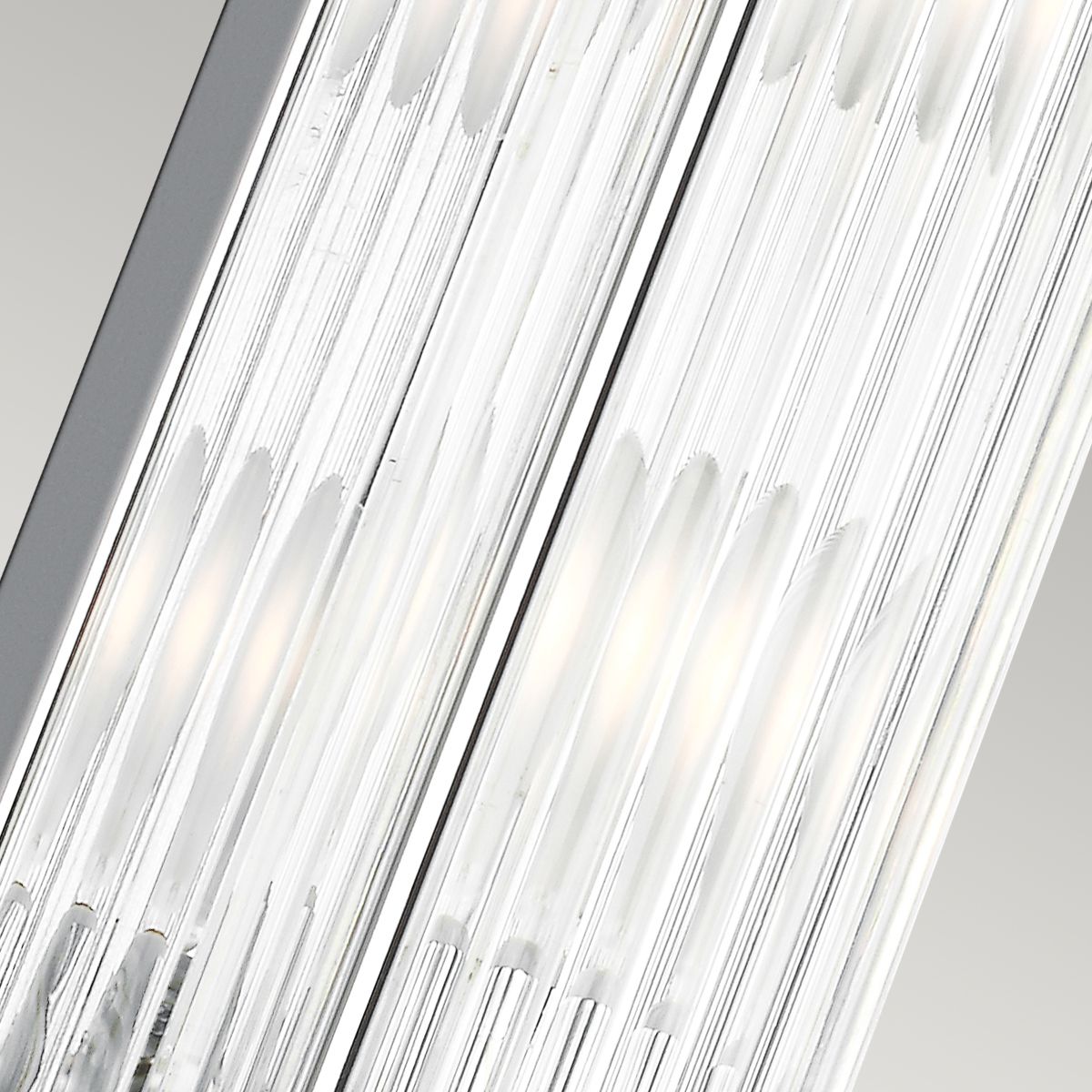 Nowoczesny kinkiet pionowy na cztery żarówki, długi klosz z cienkich przezroczystych szklanych rurek w chromowanej oprawie z eleganckimi dodatkami.