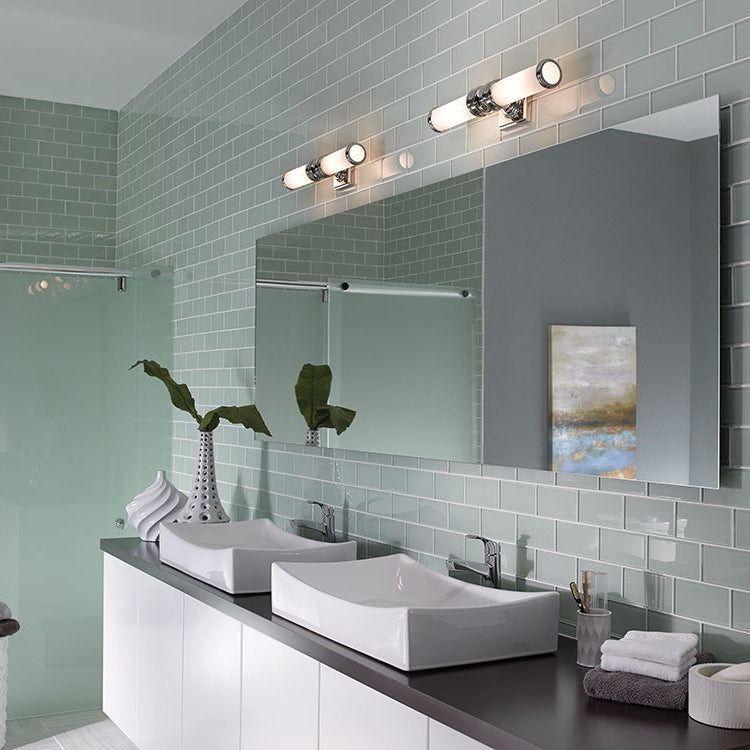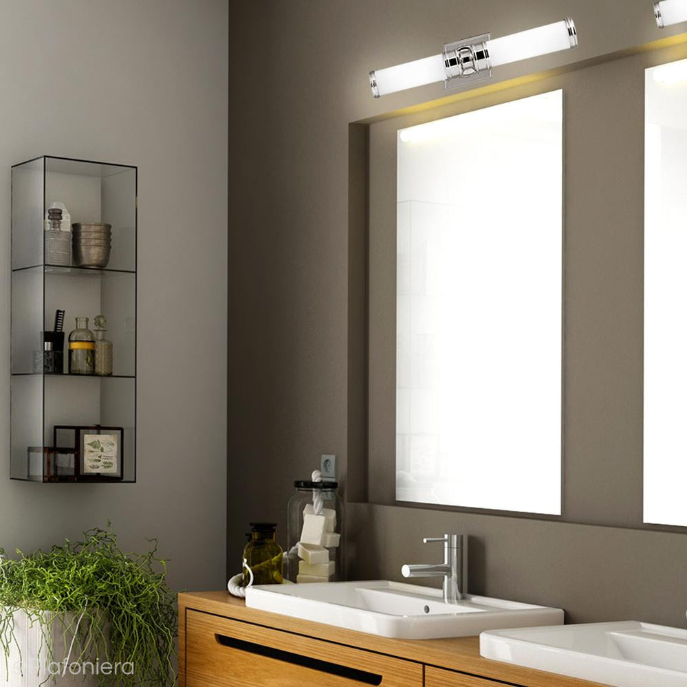 Nowoczesna kinkiet poziomy zainspirowany angielskimi lampami z XV wieku, mleczne, szklane klosze oprawione w chromowane pierścienie z eleganckimi, ozdobnymi detalami, o podwyższonej klasie szczelności IP 44, dedykowany do łazienek, nad lustro ale równie dobrze sprawdzi się w salonie, w sypialni, obok łóżka zamiast nocnych lampek, w kuchni, hotelu, restauracji urządzonych w stylu nowojorskim, nowoczesnym, skandynawskim, neoklasycznym i retro.