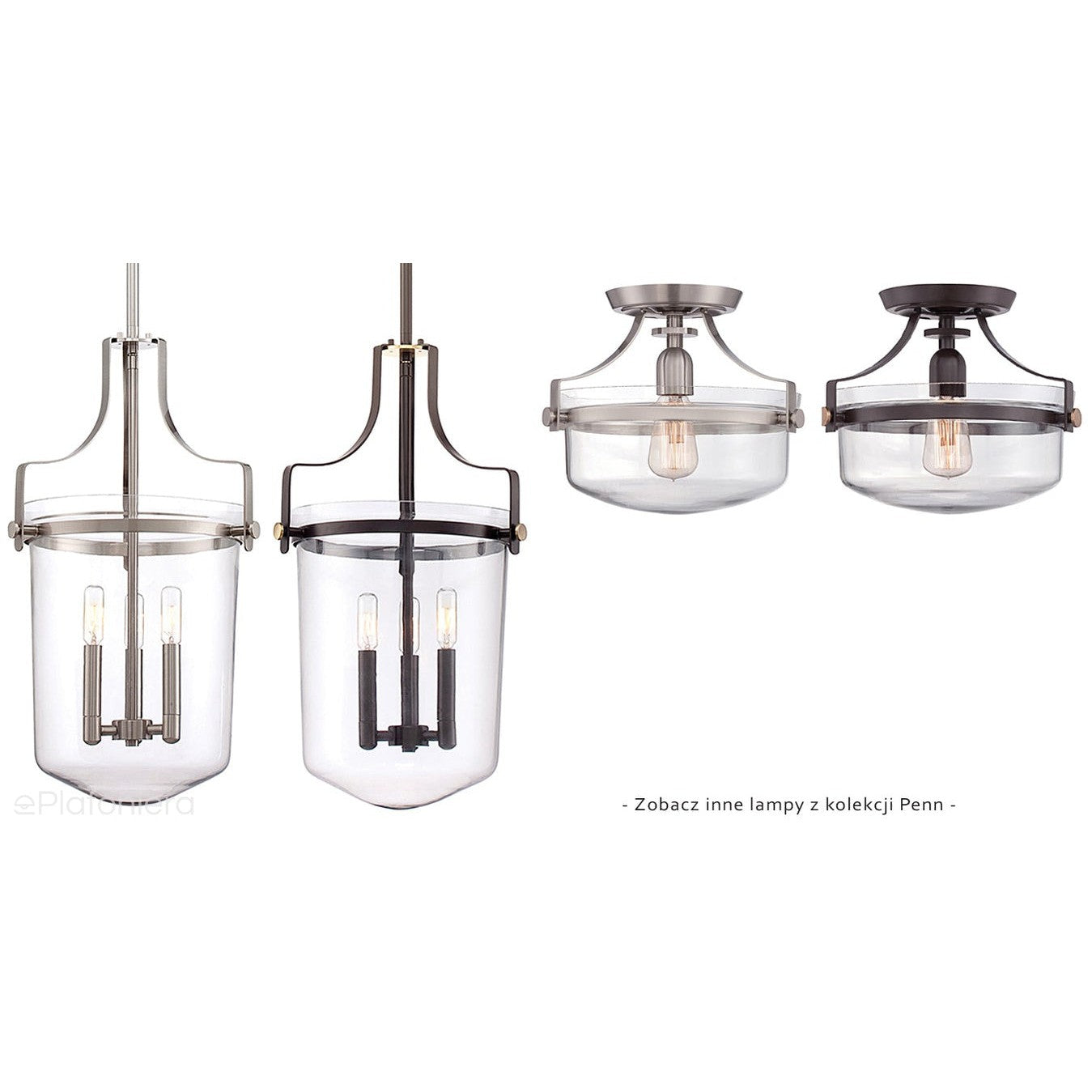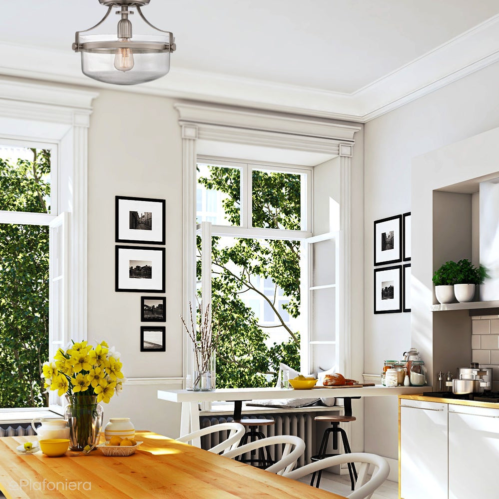 Nowoczesna plafoniera na krótkiej nóżce, efektowne detale ozdobne z niklu, na których utrzymuje się urokliwy szklany, przezroczysty klosz, którego pierwowzorem były lampy z historycznej stacji kolejowej w Nowym Yorku, z widoczną żarówką.