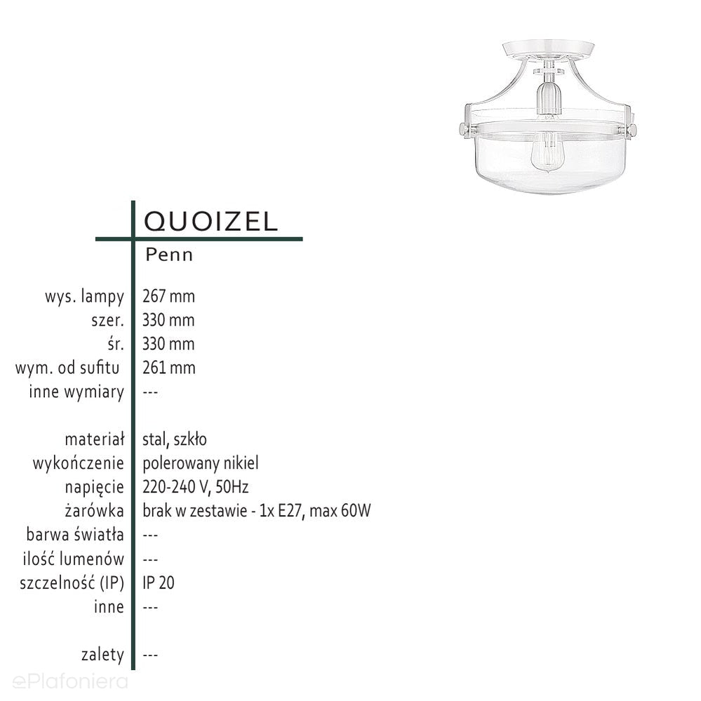 Szklana lampa (nikiel) sufitowa 33cm (1xE27) do kuchni sypialni salonu, Quoizel (Penn)