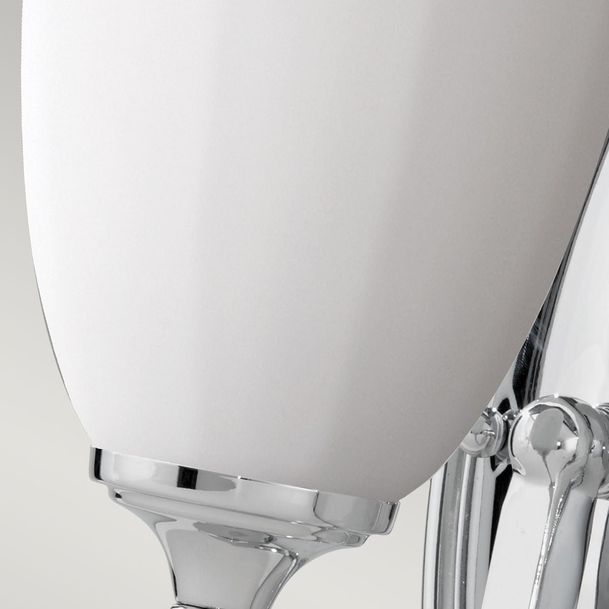 Uniwersalny kinkiet, podstawa z miękkiej stali w kolorze polerowanego chromu z lekko pofałdowanym kloszem – kielichem, wykonanym z mlecznego szkła.