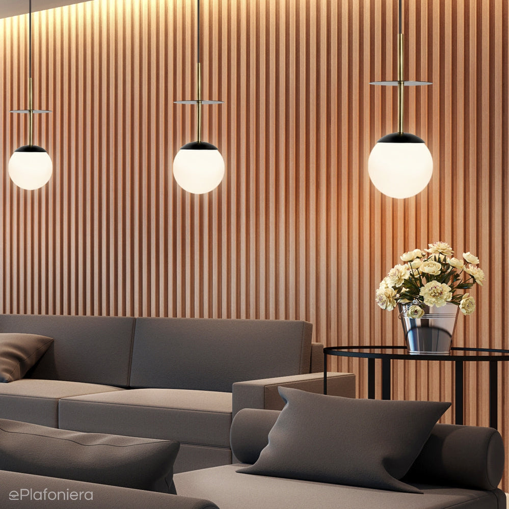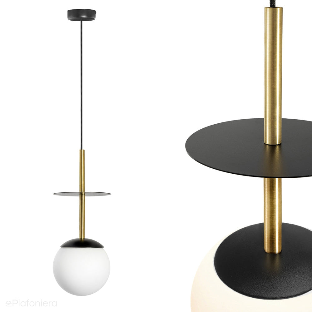 Nowoczesna, designerska lampa wisząca na kablu, częściowo ukrytym w mosiężnej rurce, przeciętej dyskiem, pod którym, jak pod parasolem, skrywa się biała, szklana kula.