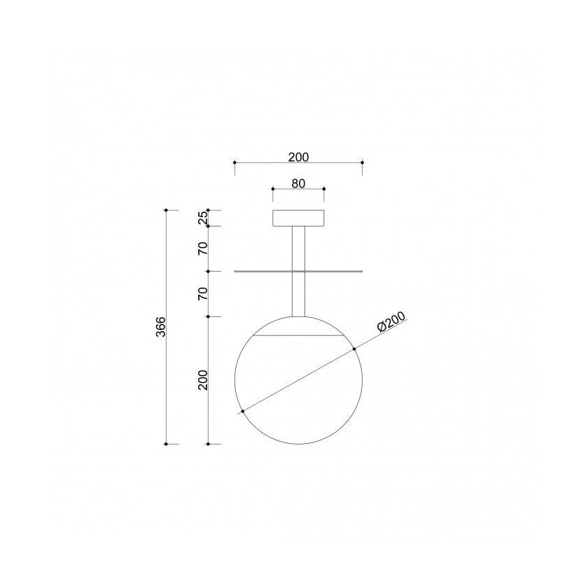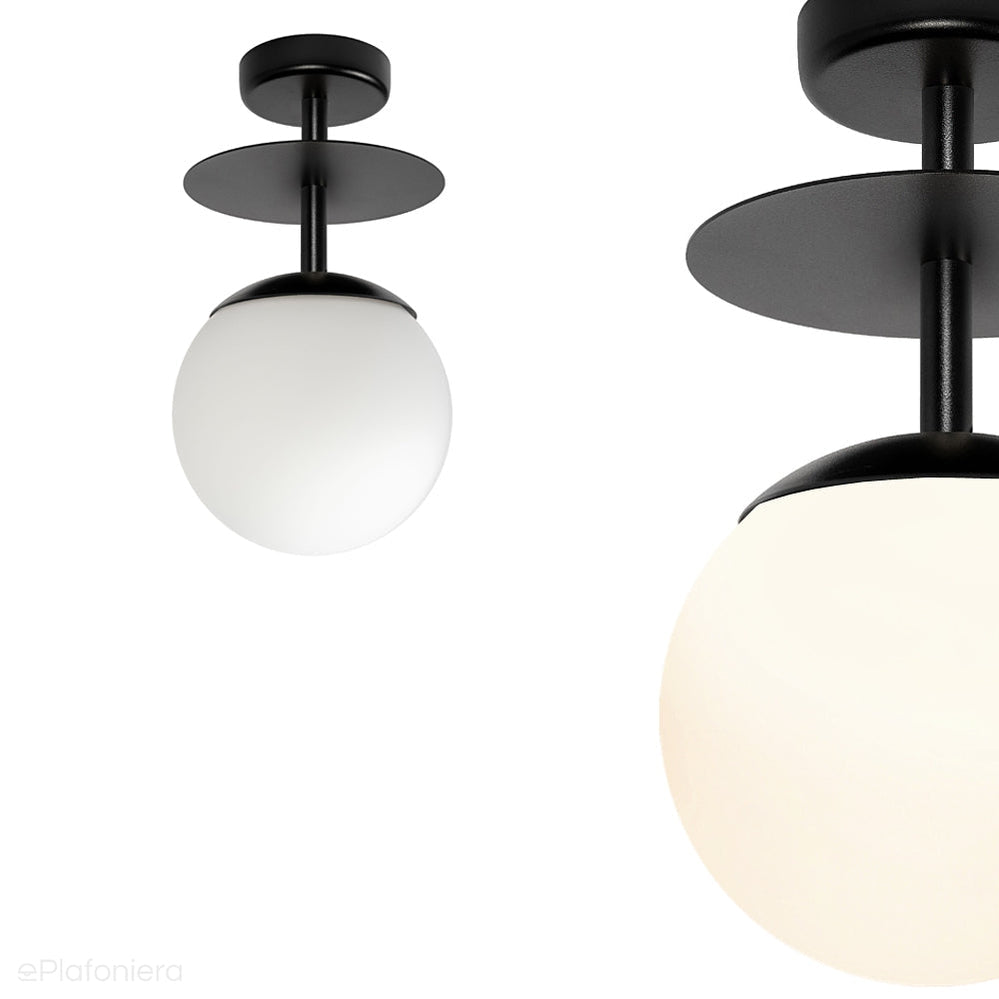 Nowoczesna, designerska plafoniera, na czarnej rurce, przeciętej dyskiem, pod którym, jak pod parasolem, skrywa się biała, szklana kula.