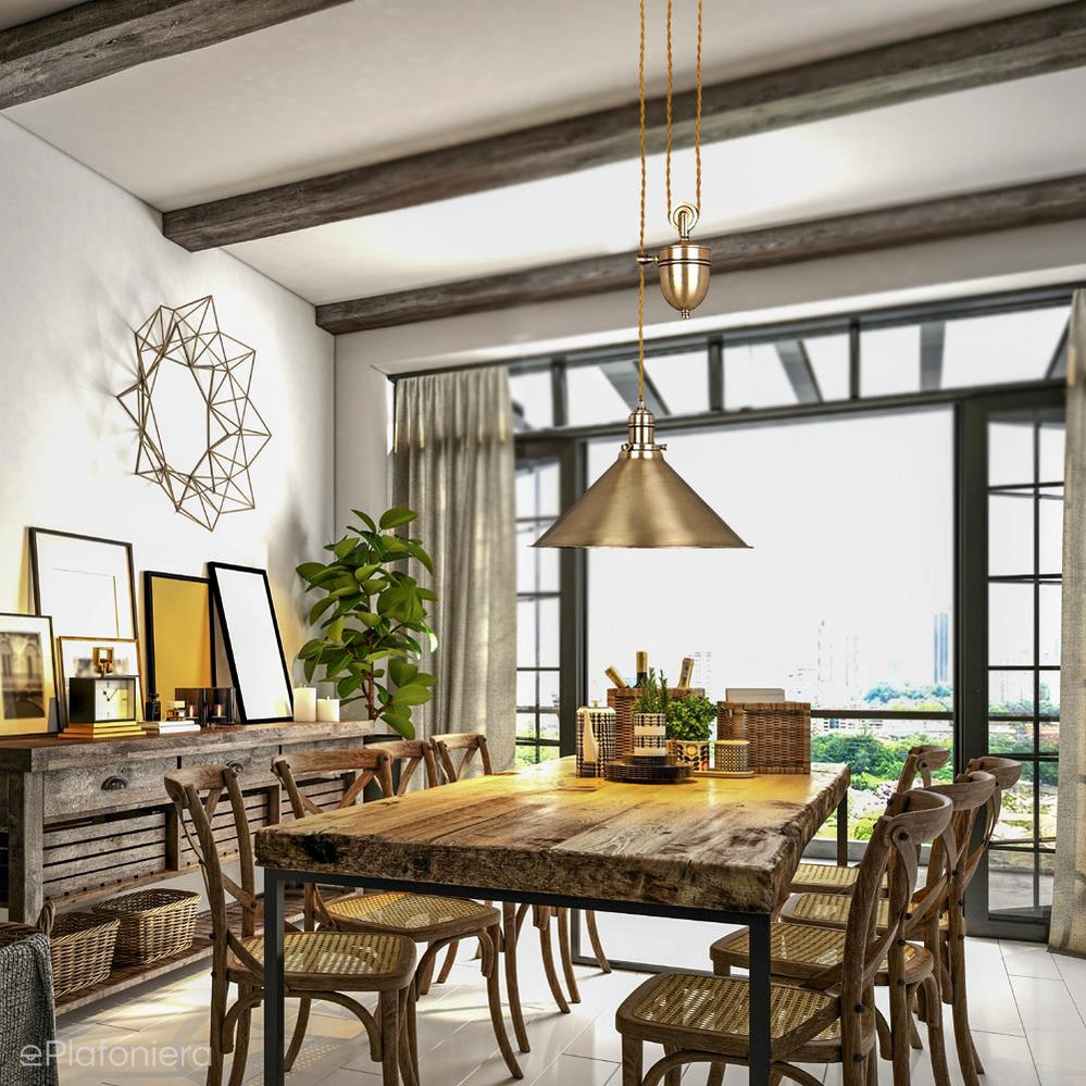 Nowoczesna lampa wisząca na skręconym kablu o regulowanej długości z ozdobną przeciwwagą, wzorowana na lampach z początku XX wieku oświetlających francuskie lokale gastronomiczne, stożkowaty klosz ze stali miękkiej w kolorze starego mosiądzu.