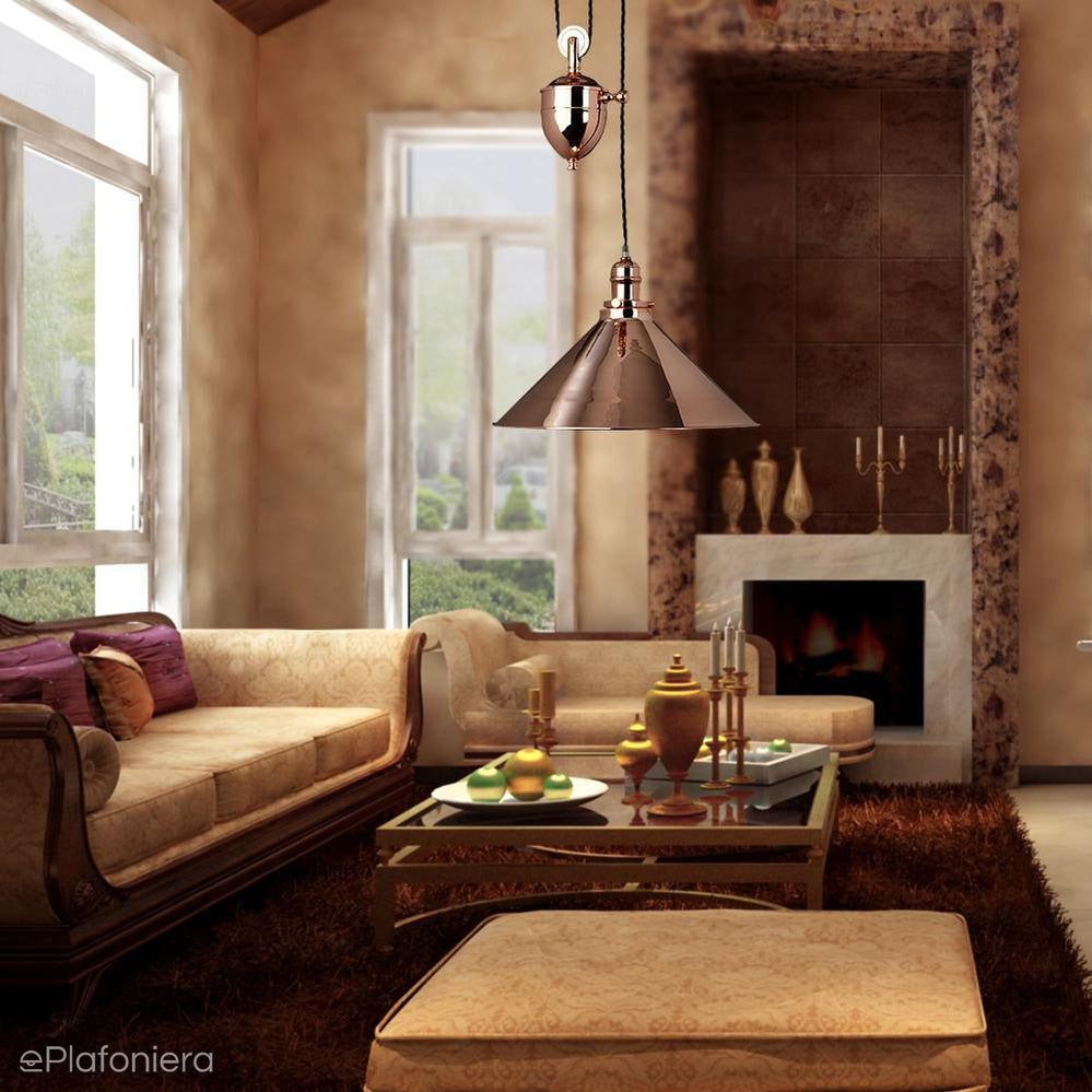 Nowoczesna lampa wisząca na skręconym kablu o regulowanej długości z ozdobną przeciwwagą, wzorowana na lampach z początku XX wieku oświetlających francuskie lokale gastronomiczne, stożkowaty klosz ze stali miękkiej w kolorze polerowanej miedzi.