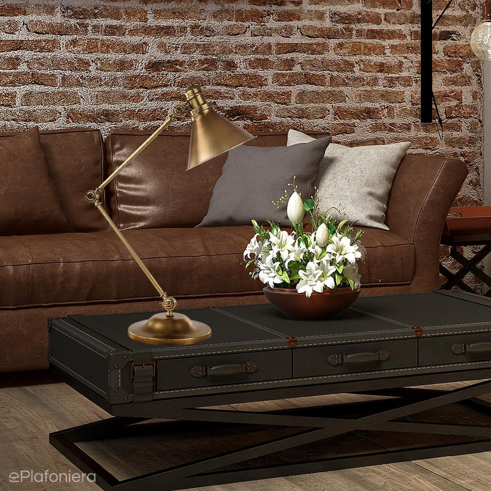 Nowoczesna lampa stojąca biurkowa na łamanej nodze z możliwością ustawienia kąta padania światła i ciekawą aranżacją przestrzeni, wzorowana na lampach z początku XX wieku oświetlających francuskie lokale gastronomiczne, stożkowaty klosz ze stali miękkiej w kolorze starego mosiądzu.