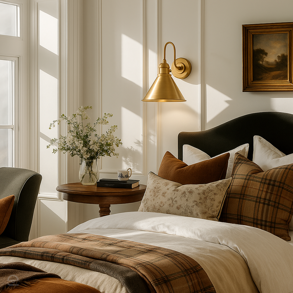 Nowoczesna kinkiet, wzorowany na lampach z początku XX wieku oświetlających francuskie lokale gastronomiczne, stożkowatych klosz ze stali miękkiej w kolorze starego mosiądzu na wygiętym ramieniu.