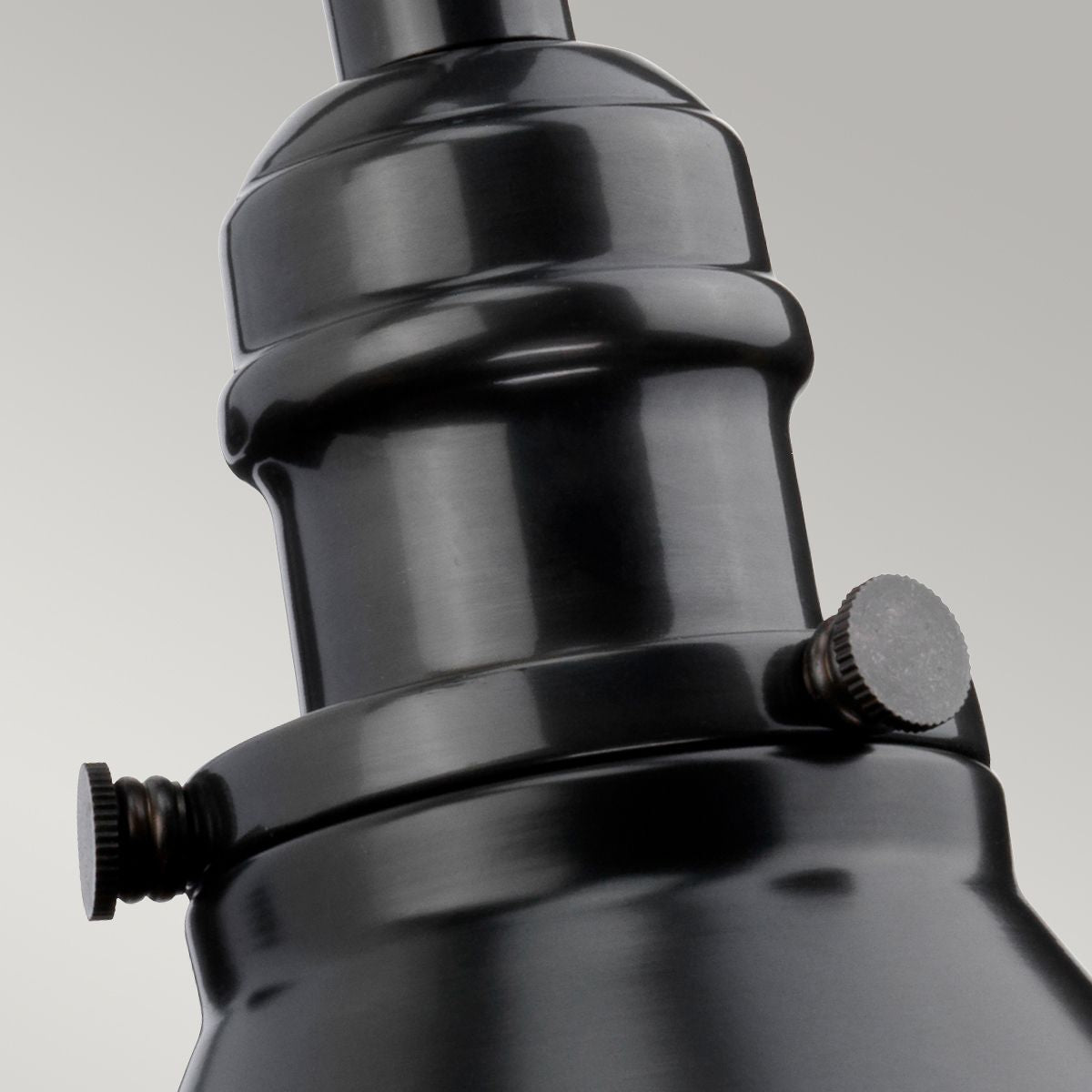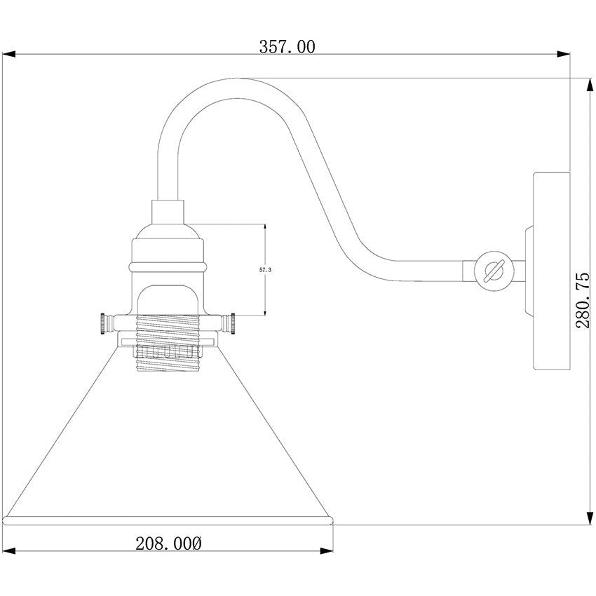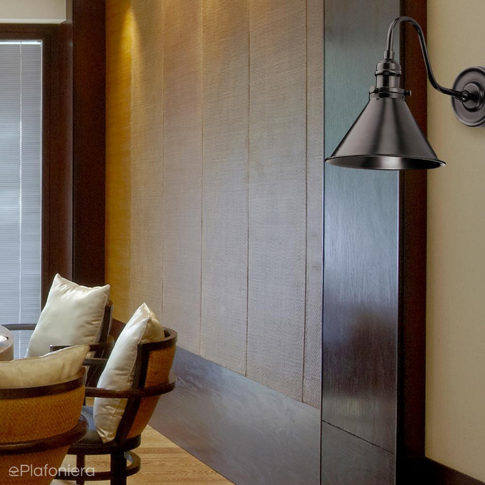 Nowoczesna kinkiet, wzorowany na lampach z początku XX wieku oświetlających francuskie lokale gastronomiczne, stożkowatych klosz ze stali miękkiej w kolorze starego brązu na wygiętym ramieniu.