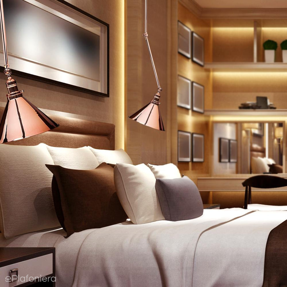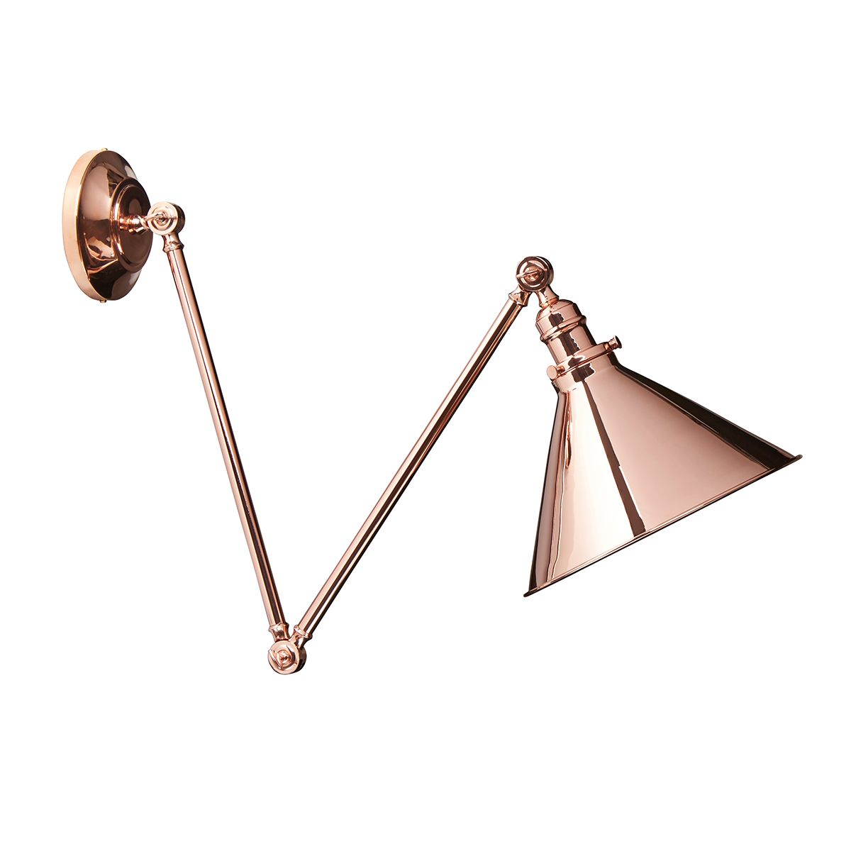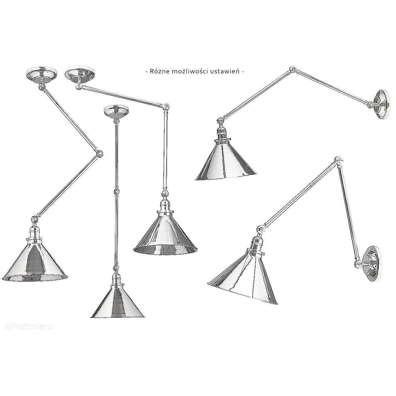 Nowoczesna lampa wisząca na łamanym ramieniu -lub kinkiet z możliwością ustawienia kąta padania światła i ciekawą aranżacją przestrzeni, wzorowana na lampach z początku XX wieku oświetlających francuskie lokale gastronomiczne, stożkowaty klosz ze stali miękkiej w kolorze polerowanej miedzi.