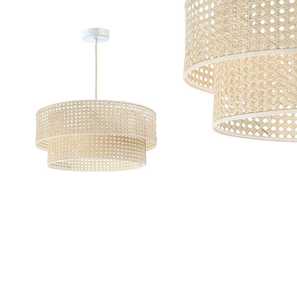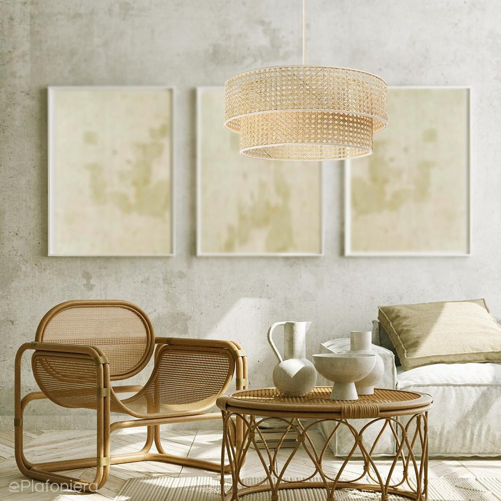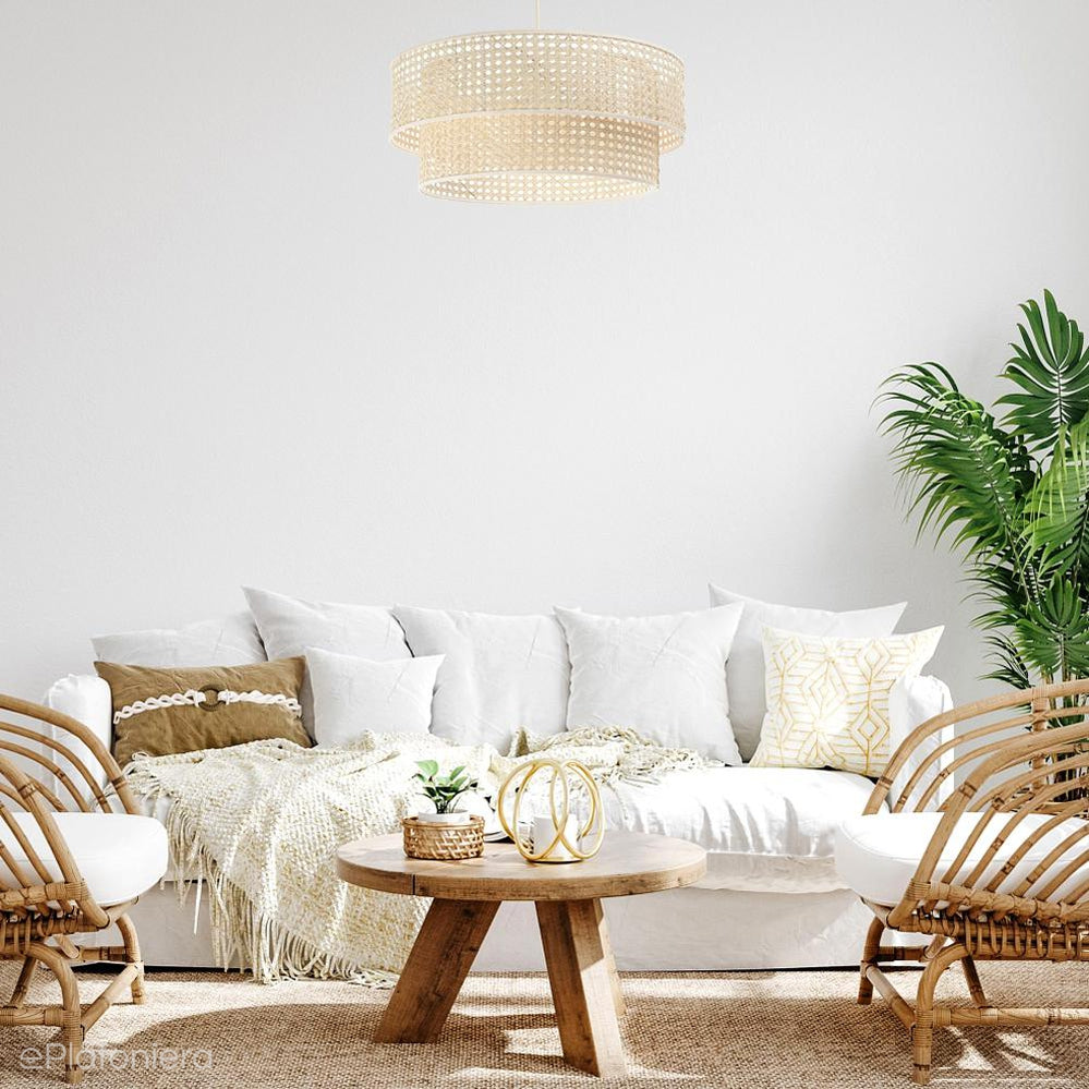 Rattanowa lampa wisząca w romantycznym stylu boho, dwa walece wykonane z włókien palmy rotangowej, bez tworzyw sztucznych.