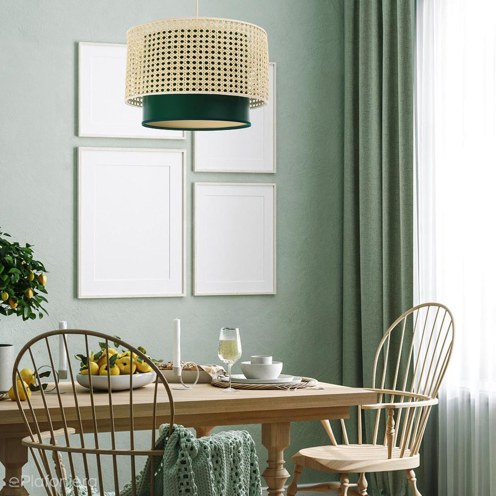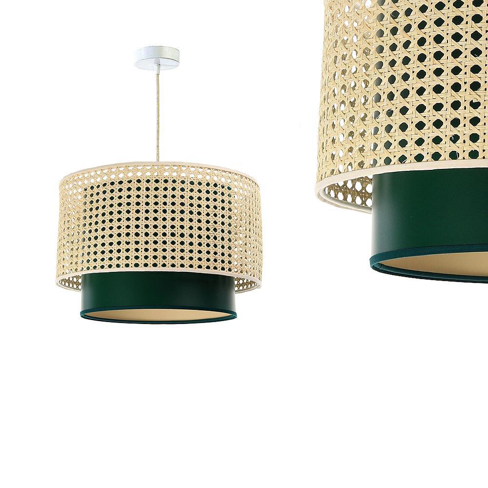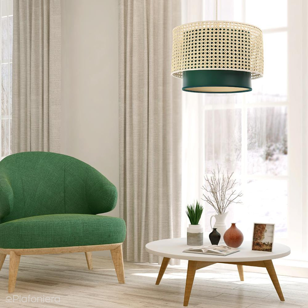 Rattanowo-satynowa lampa wisząca w romantycznym stylu boho, dwa współśrodkowe walce, zewnętrzny wykonany z włókien palmy rotangowej, wewnętrzny satynowy w kolorze zieleni.