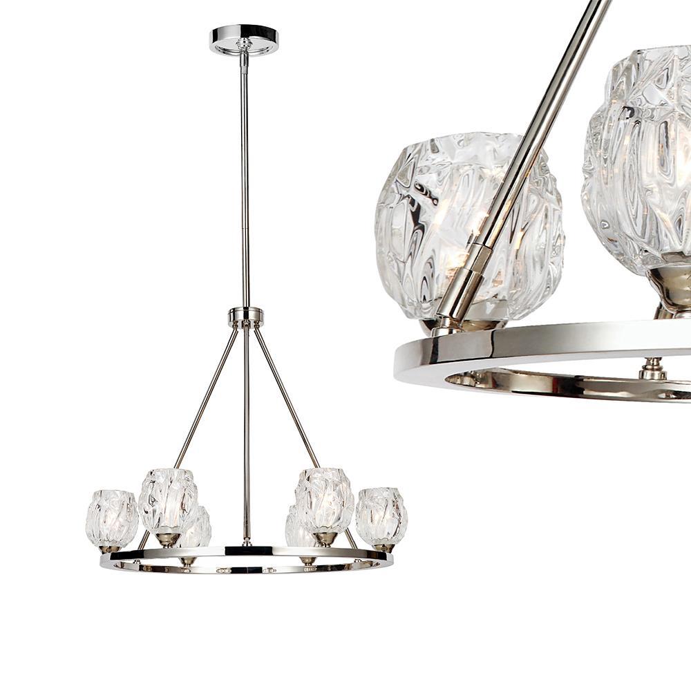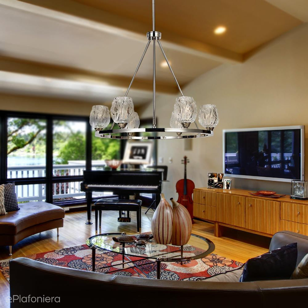 Nowoczesny żyrandol na kole, klasyka w nowoczesnym wydaniu, grubo szlifowane, szklane klosze na niklowanej, wręcz geometrycznej konstrukcji, pięknie eksponują i załamują światło.