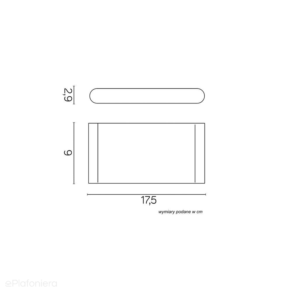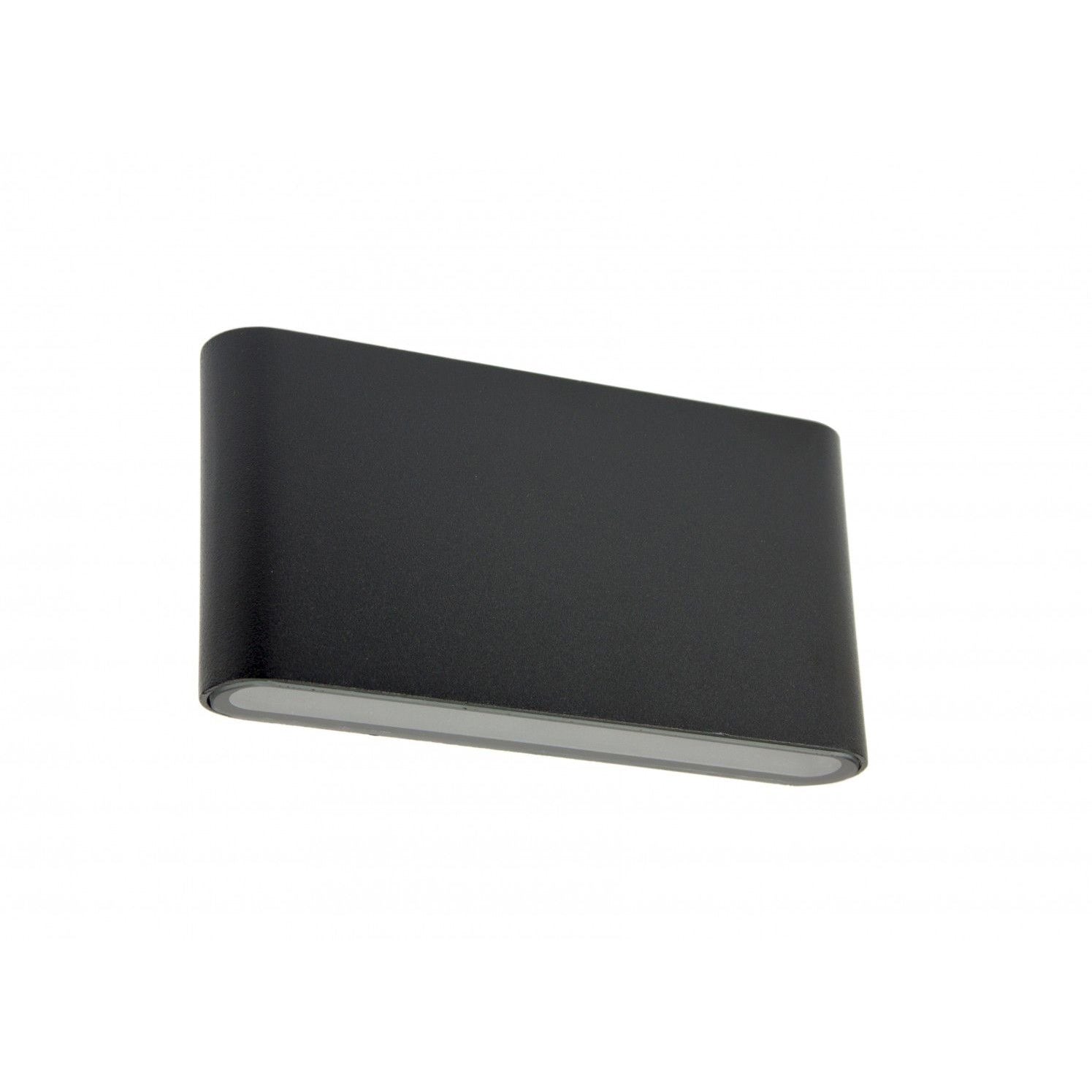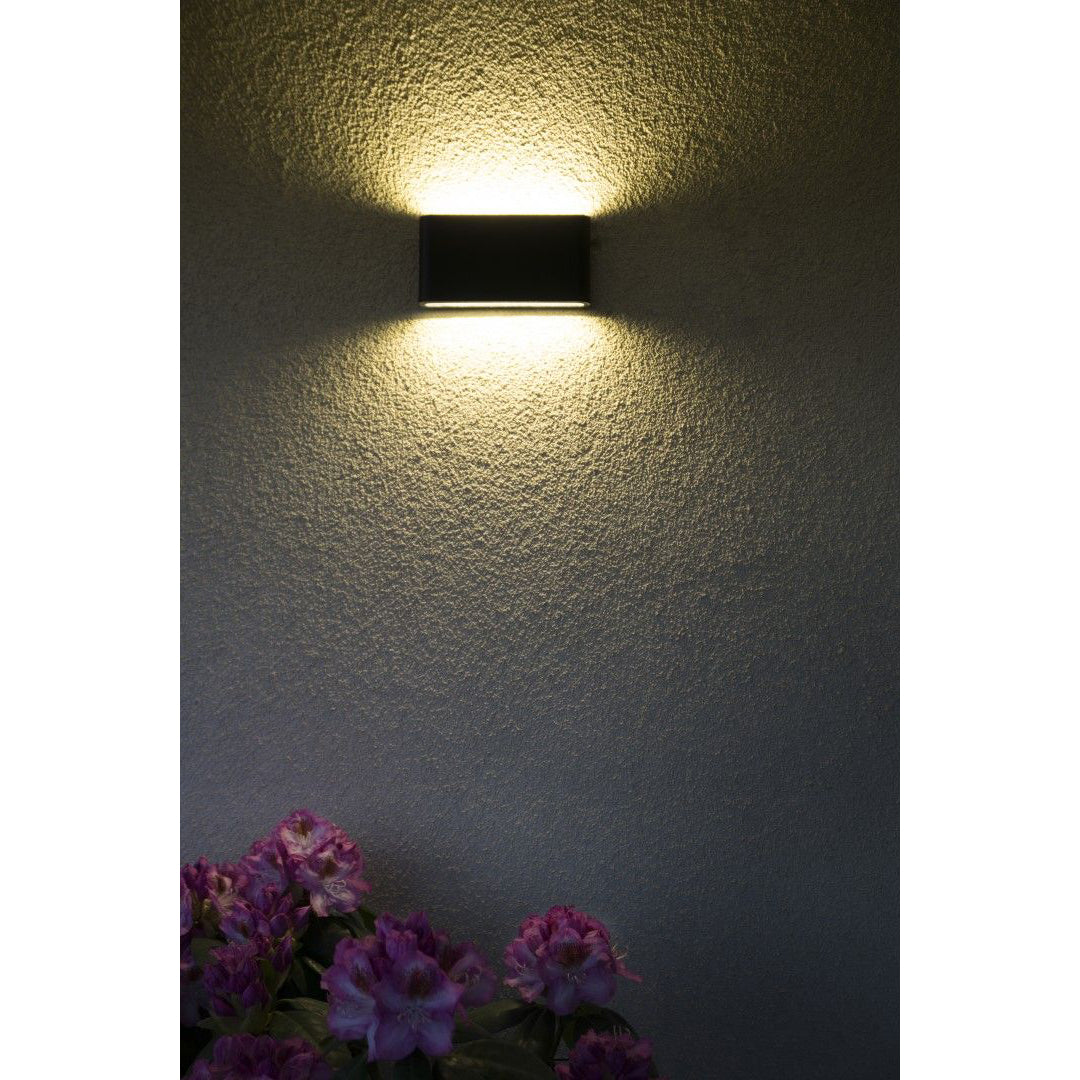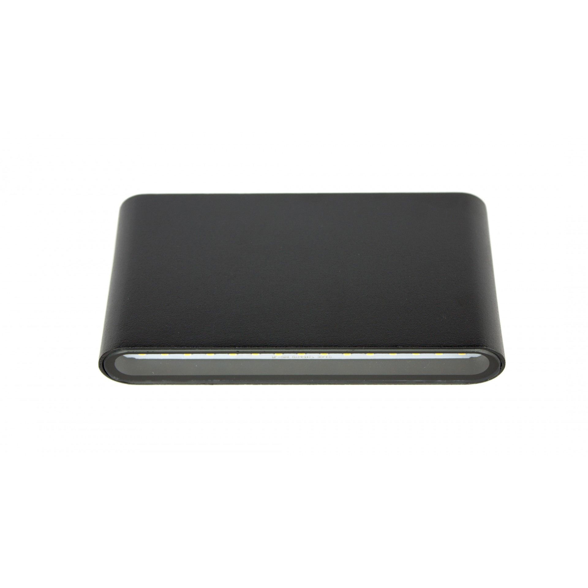 Nowoczesny kinkiet zewnętrzny o klasie szczelności IP 54, czarna, aluminiowa skrzyneczka, mocno przylegająca do elewacji budynku, dzięki zastosowaniu wbudowanego, podwójnego układu LED, świeci w dwóch kierunkach – góra, dół.