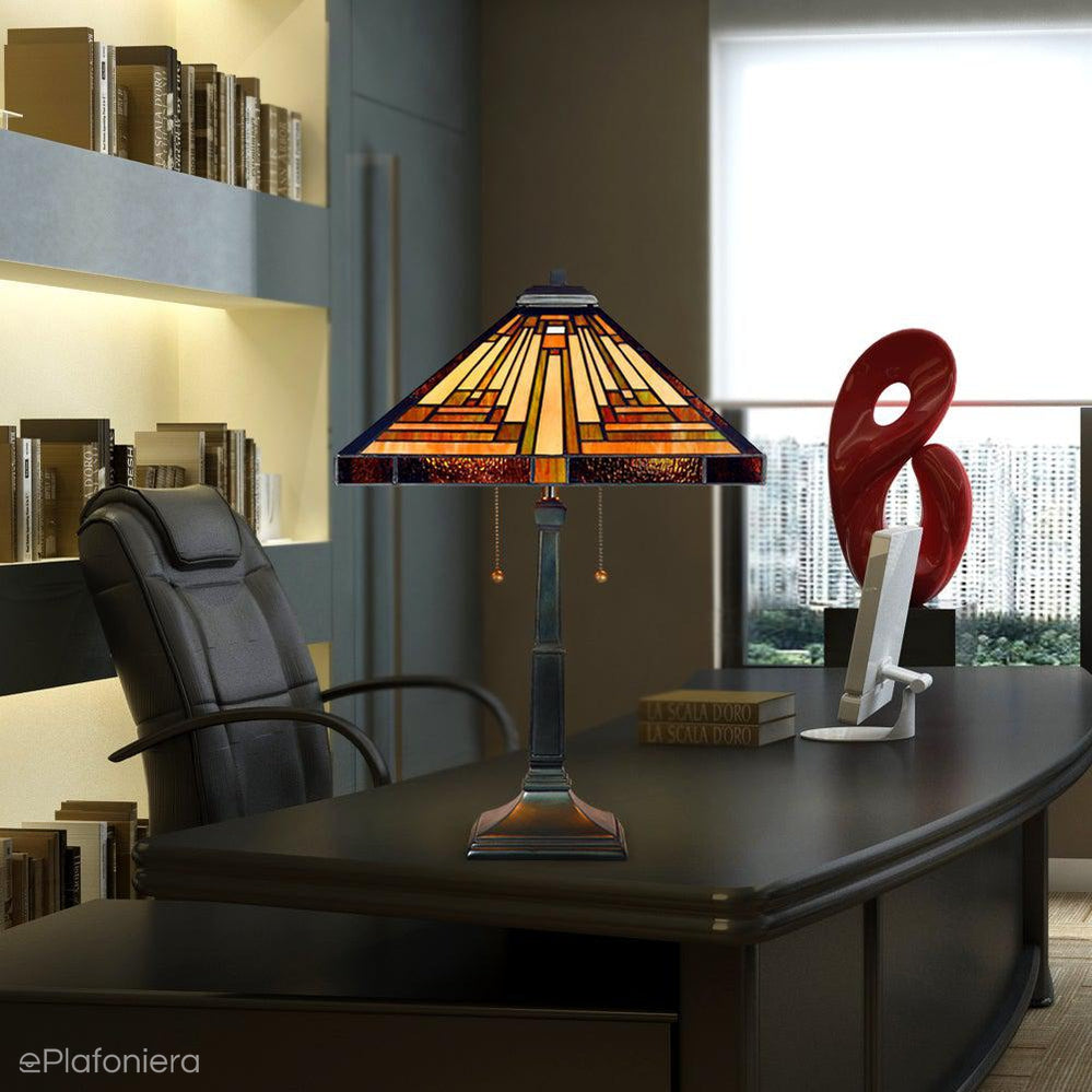 Lampa stojąca, biurkowa w stylu Tiffany, na dwie żarówki, wywodzi się z lamp witrażowych stylu art deco, wykonanie ręczne z geometrycznie ułożonych kawałków szkła w odcieniach bursztynu, biskwitowej i ziemistej zieleni.